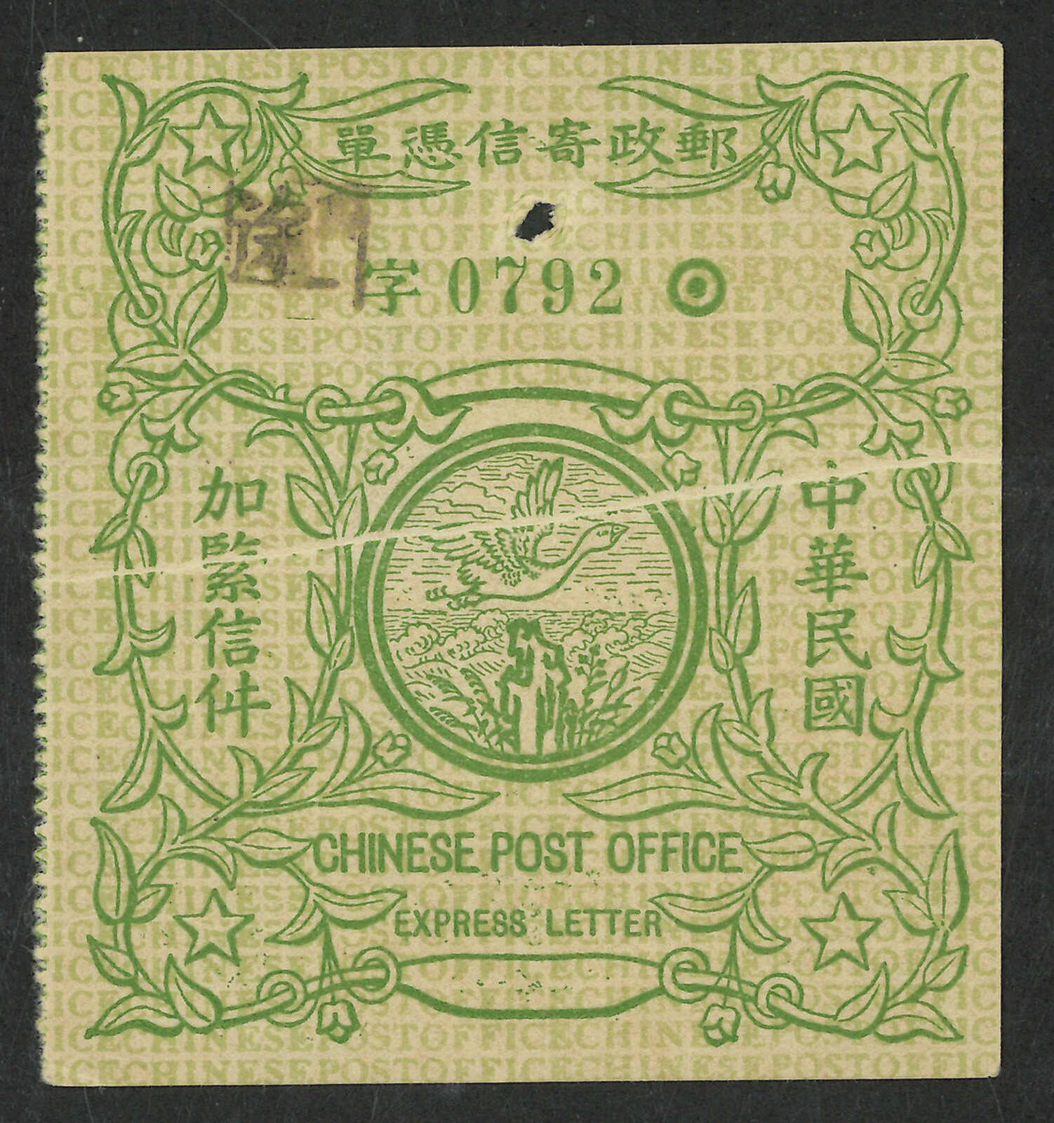 381 * image1914 ROC 2nd issue express letter stamp with paper-folded variety (Chan E9). With ink-brusk manuscript on reverse.