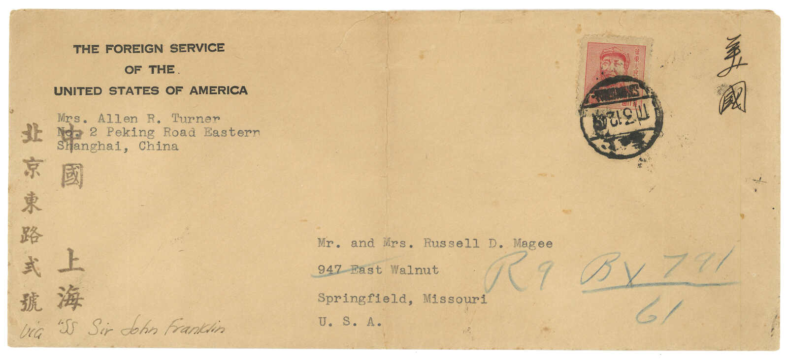 564 cover image1949 (3 Dec) "Foreign Service of USA" cover from Mrs. Allen R Turner, Shanghai to USA, f.w. East China People's Post Chairman Mao $1000, tied by Shanghai bilingunal cds. Cover at middle.