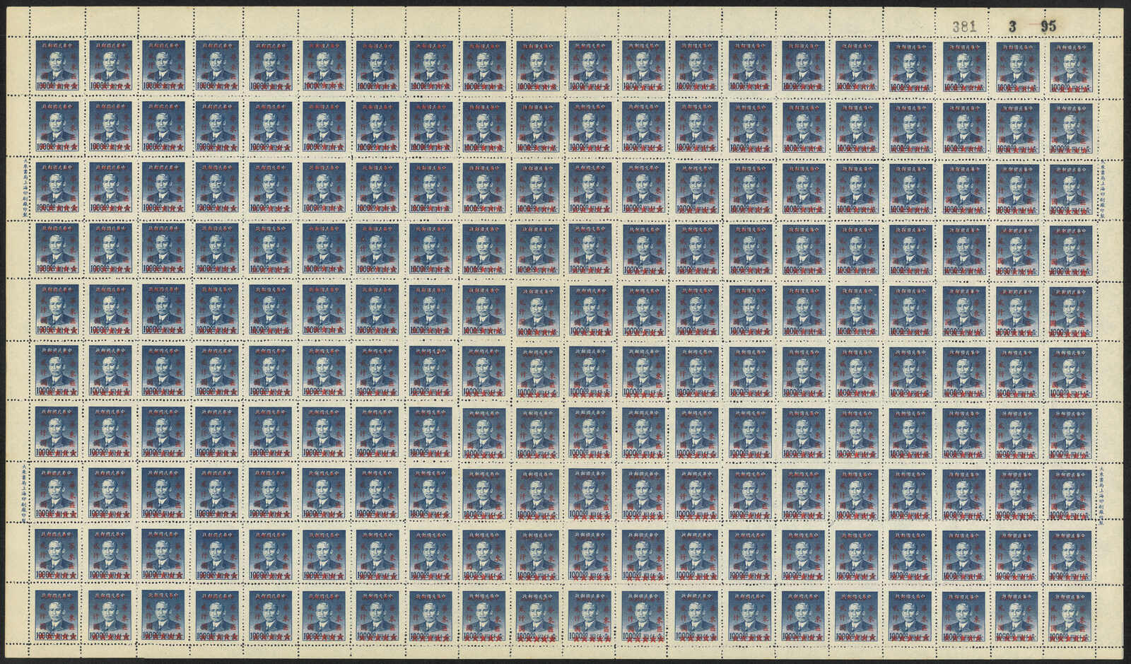 1949年華東區改值2000元蓋於14度齒孫像1000元全張200枚新(楊目EC462a),無貼折版。(Image 1) (Image 2)