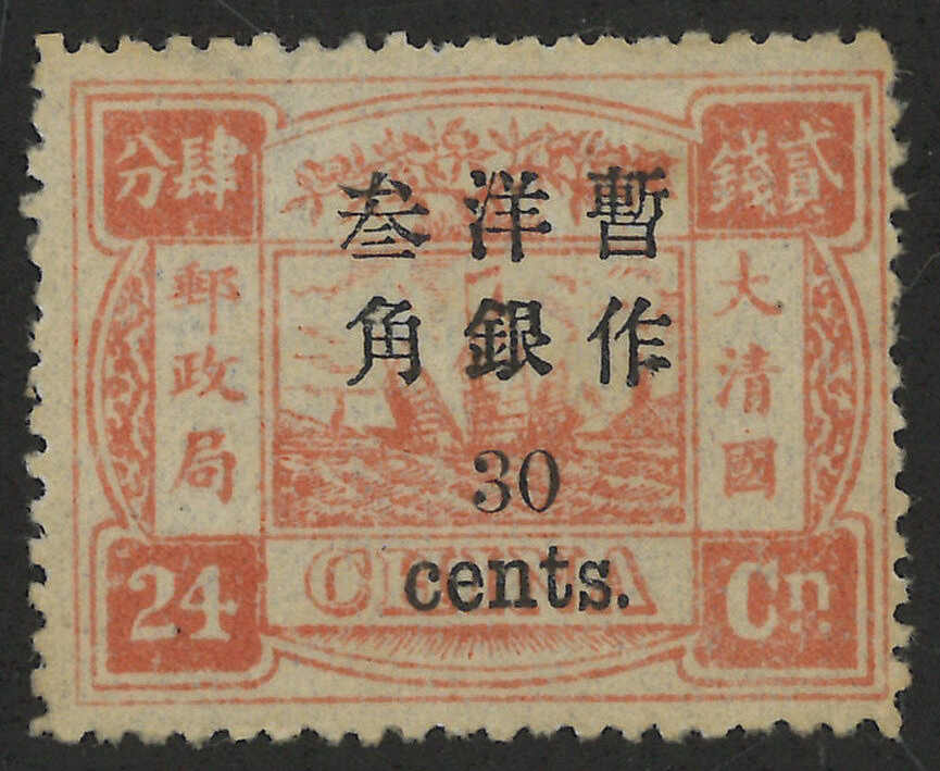 1897年慈壽初版加蓋大字長距3角蓋24分銀,帶“30”上移變異(陳目55d),銷海關日戳。按陳士仁記錄,此變異僅有11枚新票及3枚舊票存世。(Image 1) (Image 2)