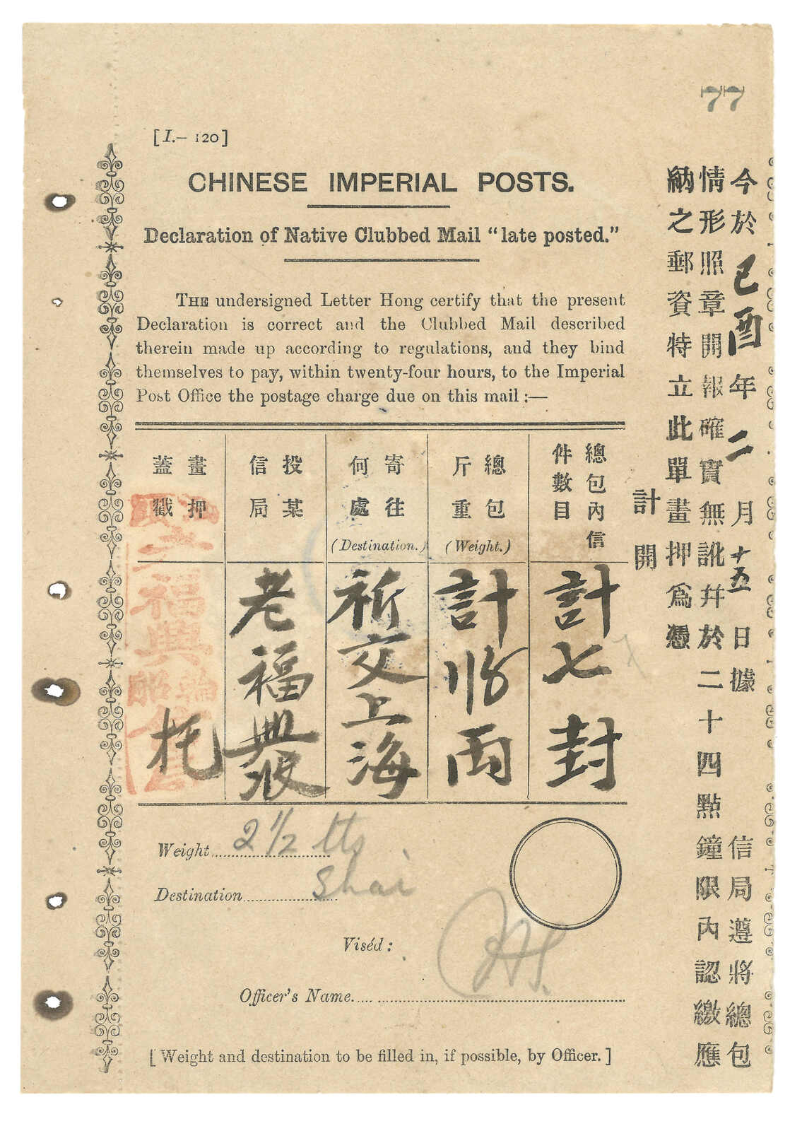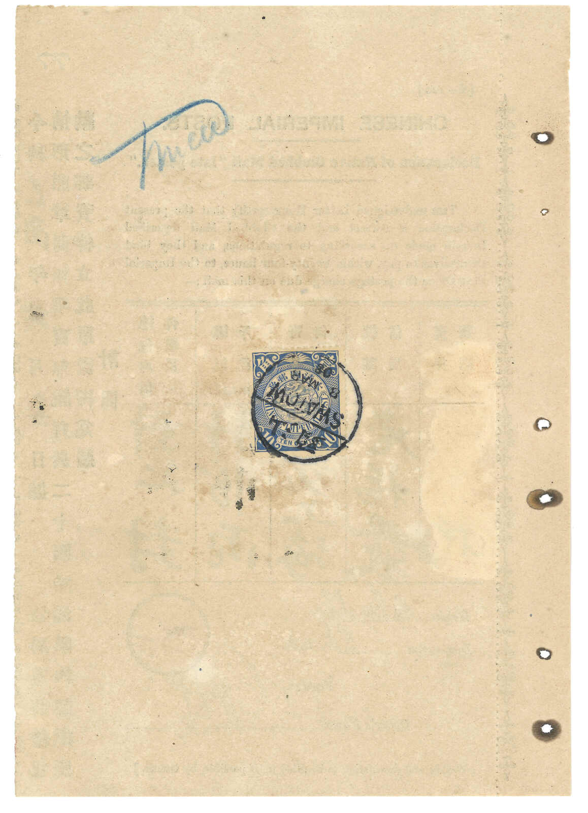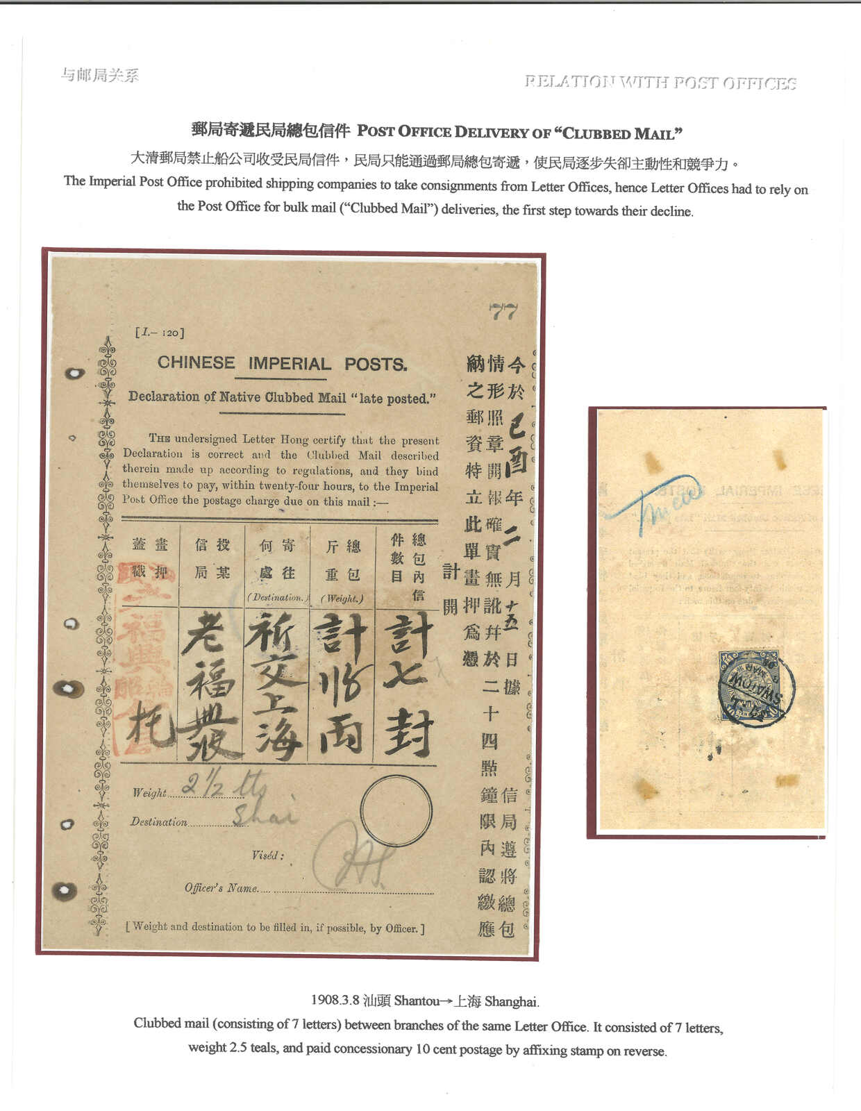 32 image1908 (8 Mar) Imperial Post Declaration of Clubbed Mail, stated consisting of 7 letters, f.w. Coiling Dragon 10c on reverse, tied by Swatow bisected bilingual cds.