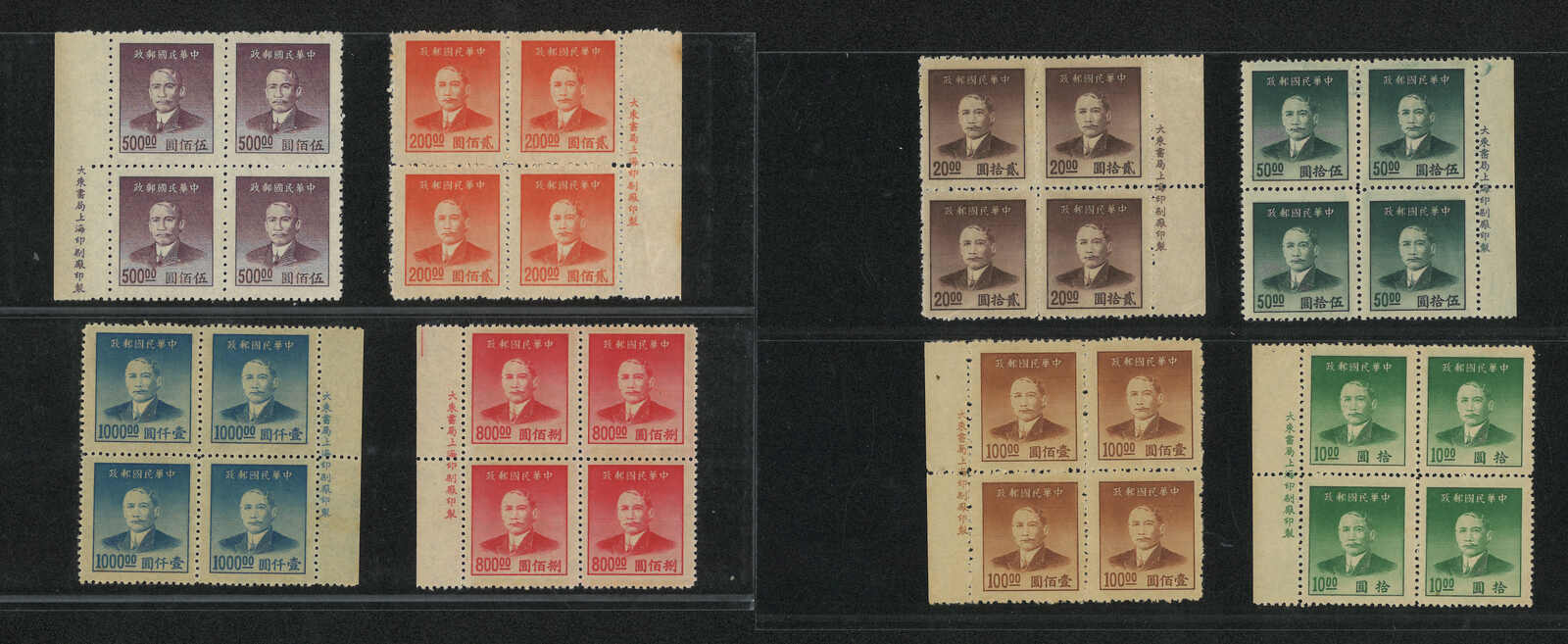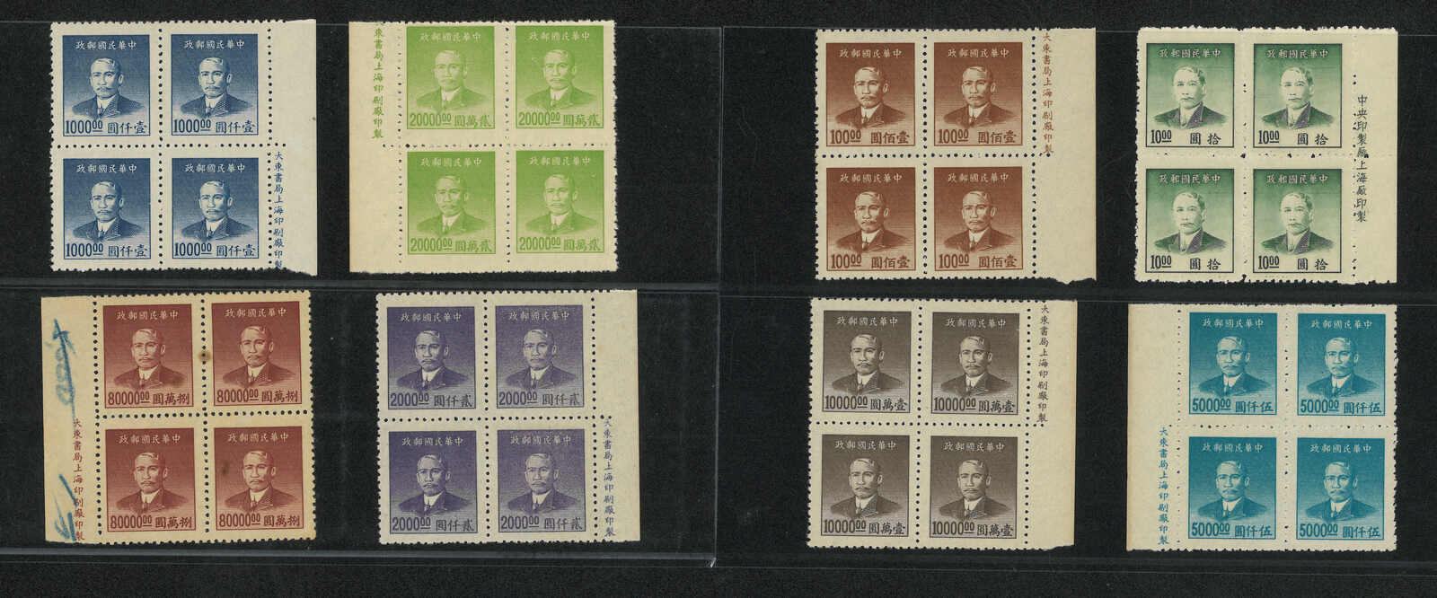 1949年上海大東凹版孫像金圓四方連一組8件新,均帶廠銘。面值由10元至800元不等。無貼。(Image 1) (Image 2)