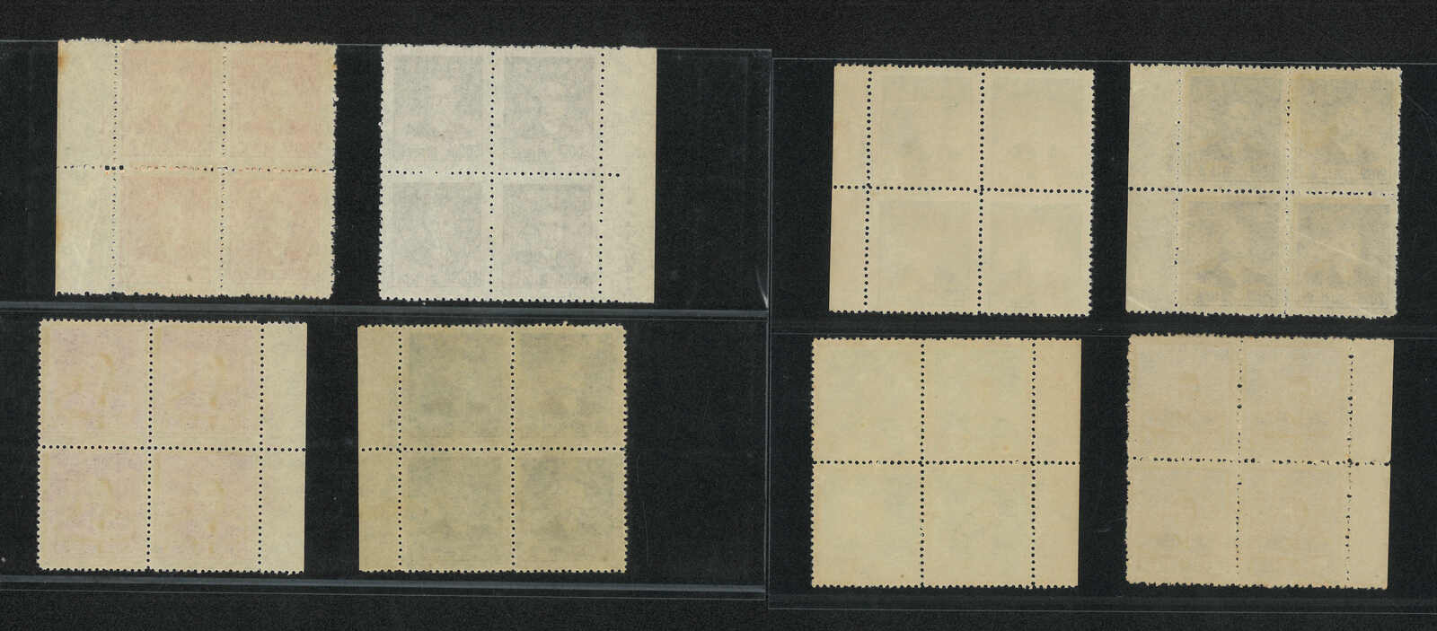 499 */bof image1949 Shanghai Dah Tung print engraved SYS Gold Yuan blocks of 4 in a group of 8, all with imprint margin. Denominations from $10 to $800. MNH.