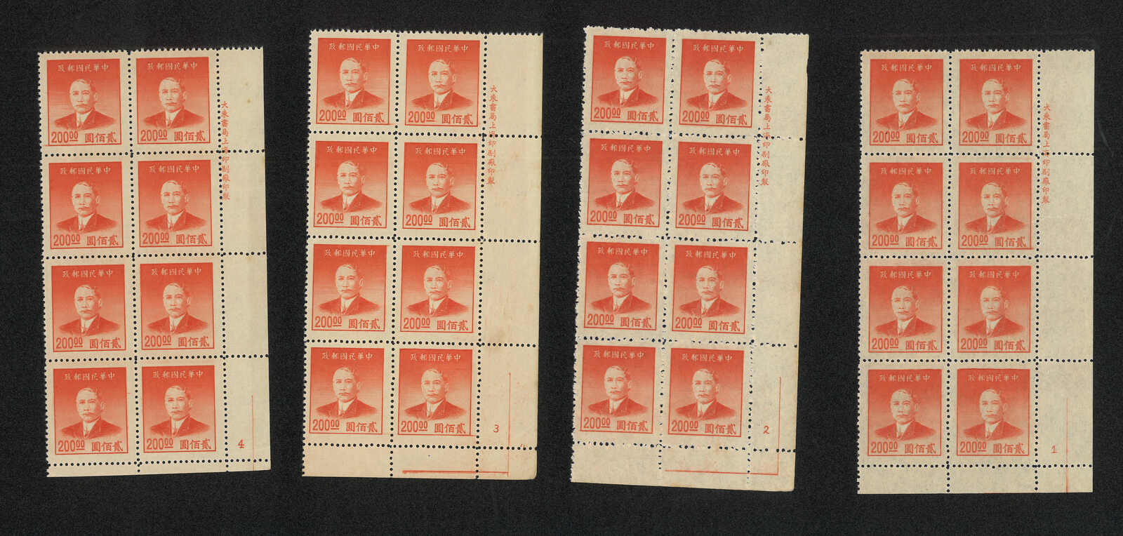 502 */bof image1949 Dah Tung Print SYS Gold Yuan $200 in 4 blocks of 8, all with bottom right corner imprint margin (Chan G133), showcasing plate numbers from 1 to 4. MNH.