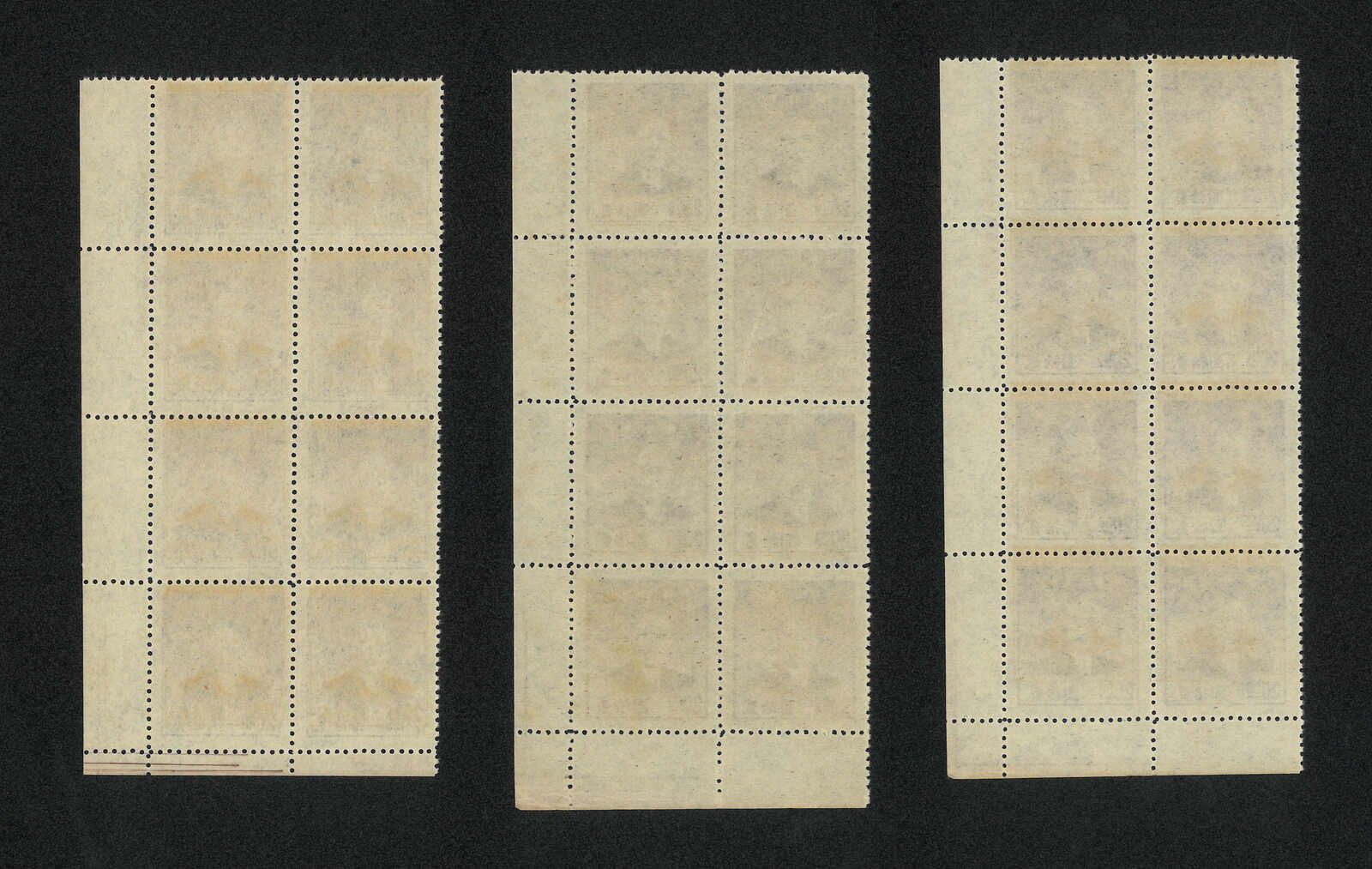 501 */bof image1949 Dah Tung Print SYS Gold Yuan $20 in 3 blocks of 8, all with bottom right imprint margin (Chan G130), showcasing plate numbers 1, 3 and 4. MNH.