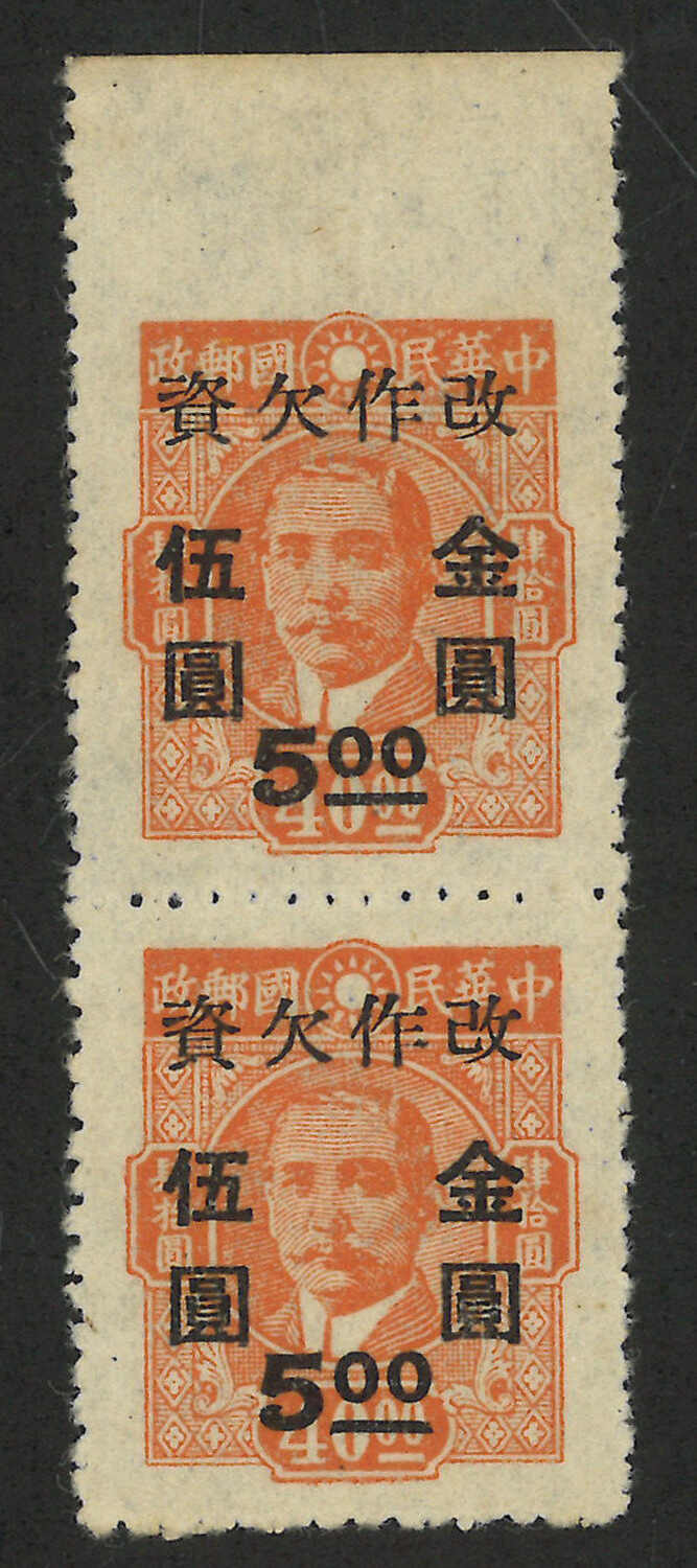 1948年加蓋改值金圓欠資票5元蓋重慶中央版孫像40元直雙連新,帶頂邊漏齒變異(陳目GD9),無貼。(Image 1) (Image 2)