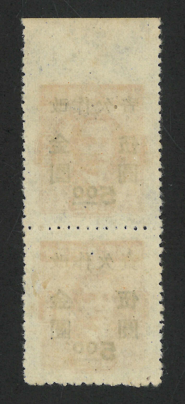 504 */bof image1948 Surcharged Gold Yuan postage due $5 on CK Central Print SYS $40 in vertical pair, with imperf top variety (Chan GD9), MNH.
