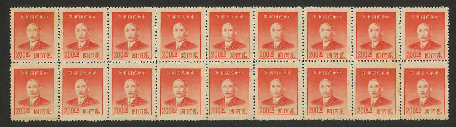 1949年上海大東版孫像金圓200元十八方連新(陳目G133),無貼,帶微黃點。(Image 1) (Image 2)