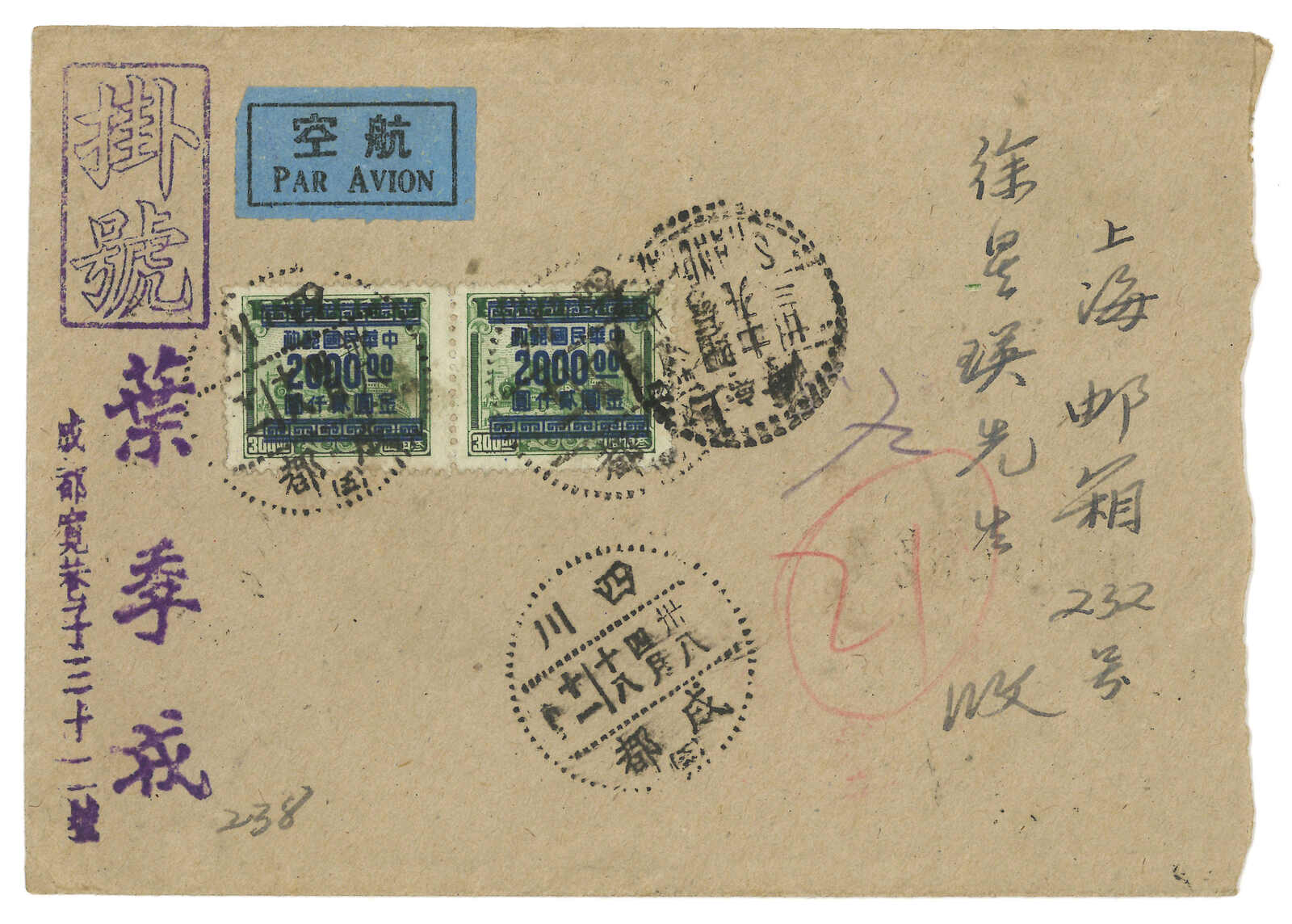 1949.4.18 成都寄上海。航空掛號封,正貼印花稅票改值金圓2000元雙連,背貼孫像、包裹票改值金圓票及孫像金圓票14枚,合7800元,銷成都點線漢英日戳。1949年4月1日至10日之國際航空掛號信函郵資為8000元,但隨後在11日及17日已調資兩次。封右方打開。(Image 1) (Image 2)