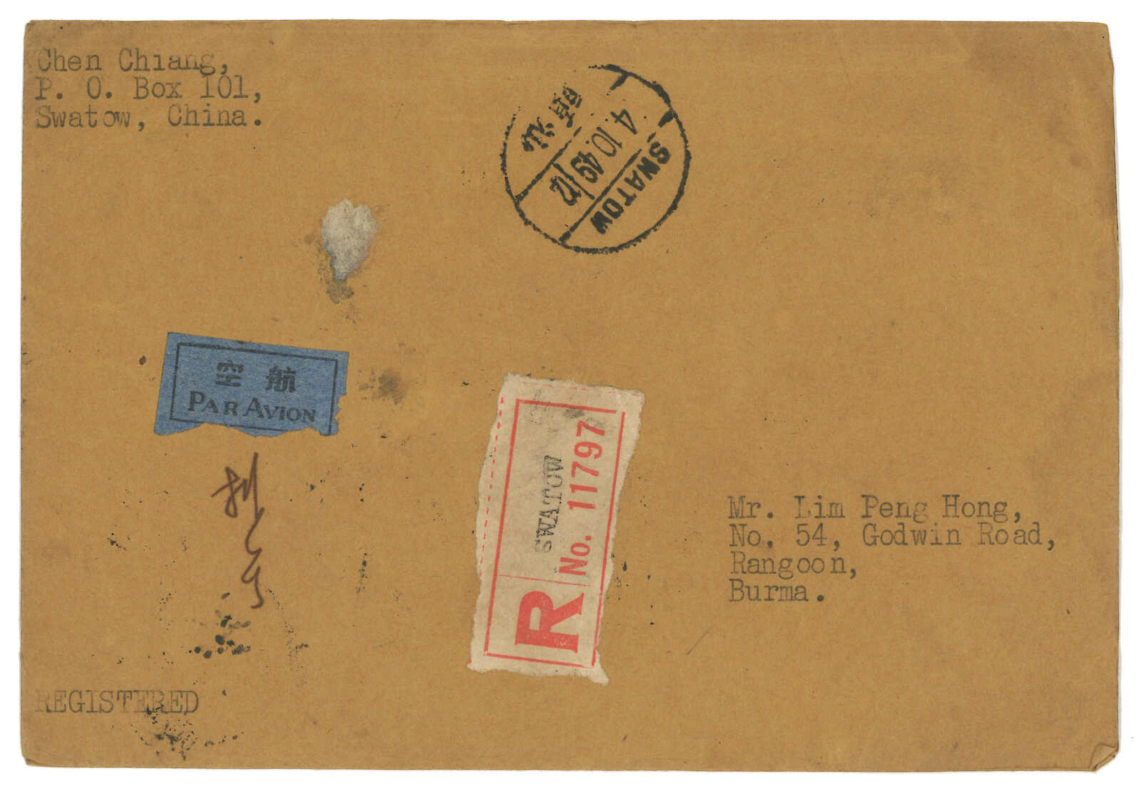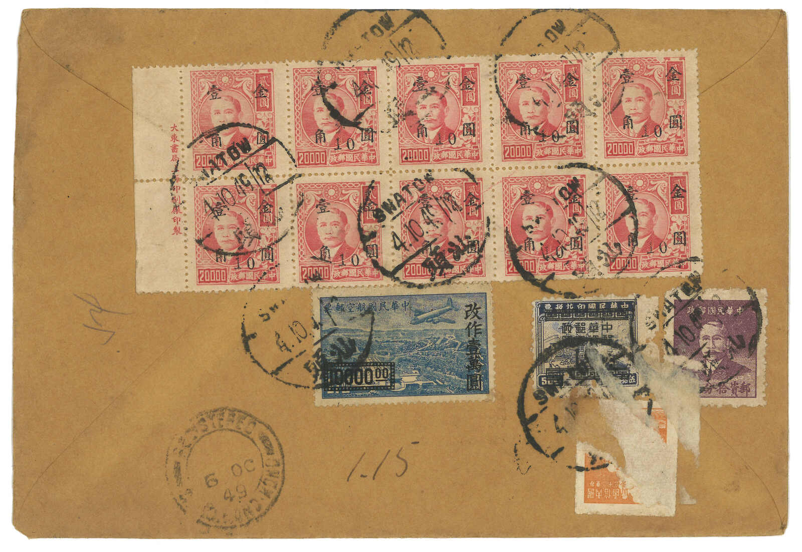 513 cover image1949 Swatow (4 Oct) to Burma. Registered airmail cover, f.w. SYS surch Gold Yuan 10c/$20000 in block of 10 + Revenue stamp surch Silver Yuam $1 + SYS Silver Yuan 10c + Domestic Ordinary mail unit stamp + airmail surch $10000 on reverse, tied by Swatow bilignual cds. Transit Hong Kong (6 Oct). Swatow was liberated on 24 Oct