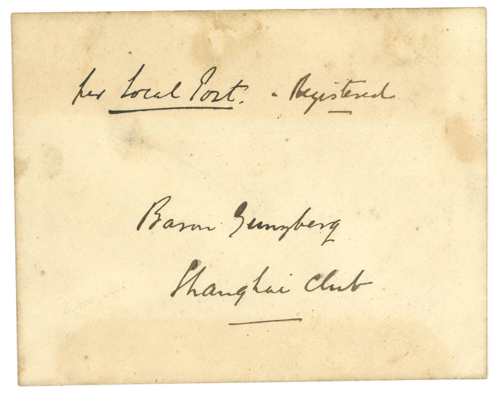 2403 cover image1893 Hankow (Nov) to Baron Gabriel de Gunzburg, Shanghai, frankless, applied with Hankow LPO origin cds on reverse. Showing "Per Local Post / Registered" annotation. Arrived Shanghai LPO.