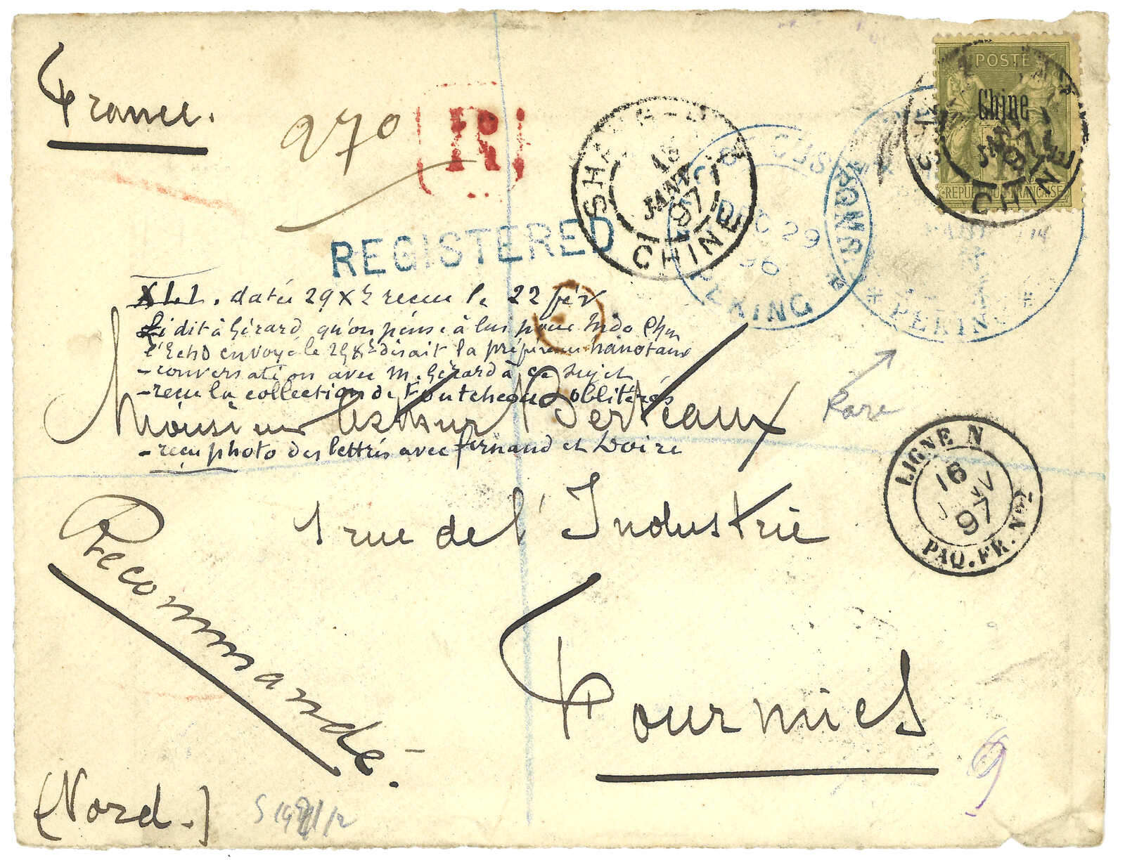 97 piece image1896 (29 Dec.) registered cover front only, to France via Shanghai, showing “Chinese Imperial Post Office/ Peking/ Postage Paid” triple-ring bilingual h.s. in blue, matching “I.G. of Customs/Peking” double-ring origin d.s and ‘registered’ handstamp; also bearing France “Chine” 1f cancelled by “Shang-hai/Chine” c.d.s. (15.1.97) with ‘R’ handstamp. Transit Ligne N (16.1). Front only, Berteaux correspondence, nevertheless very early date for this first postage paid handstamp of the Imperial Chinese Post.