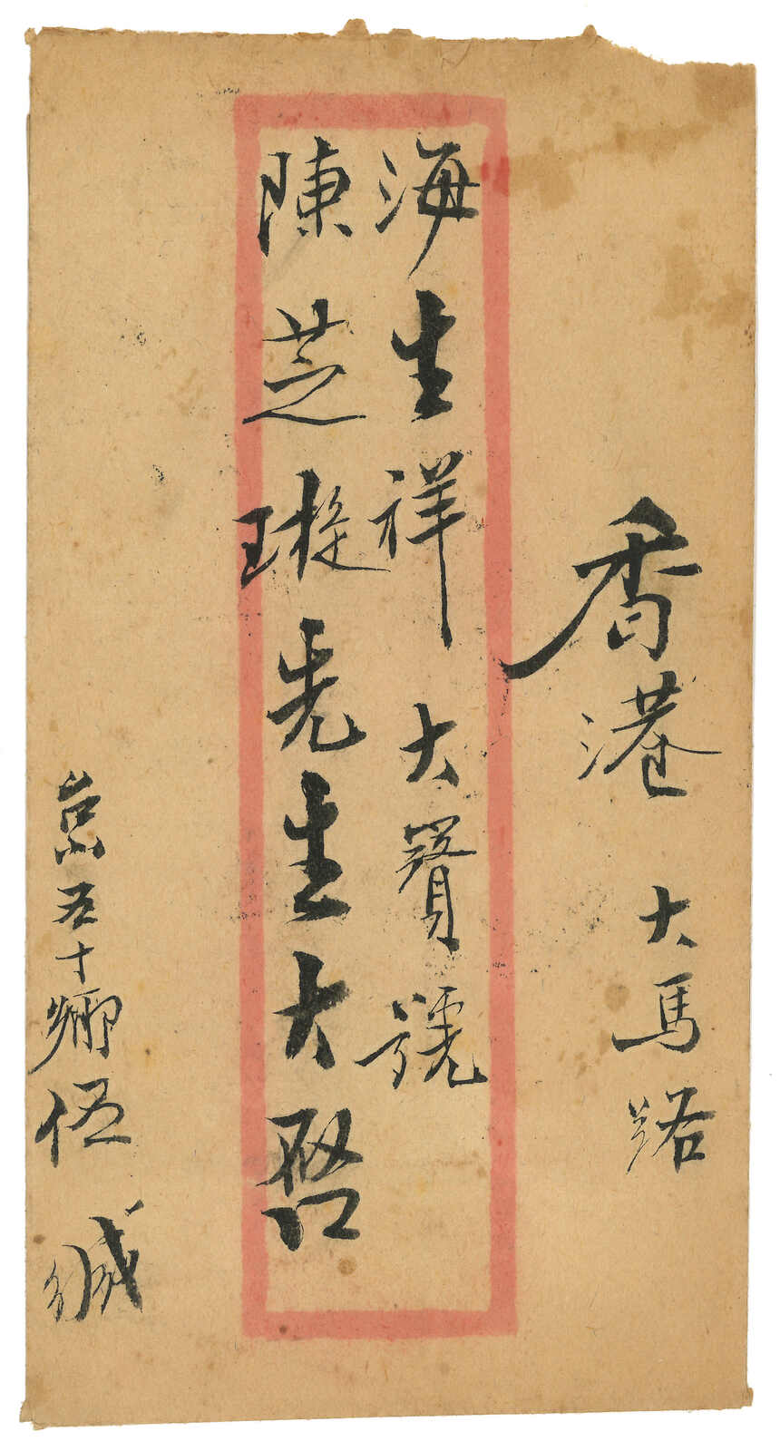 507 cover image1949 Ngshaphu (1 May) to Hong Kong. Chinese style cover, f.w. Revenue stamp surch Gold Yuan $2000/$300 x10 + SYS Gold Yuan $1000 in block of 6, in total of $26,000, tied by Kwangtung Ngshaphu cds. Cover opened at top. According to Patrick Choy, Kwangtung Postal District began to use postage rates based on Silver Yuan Base Currency on 29 Apr 1949 and the domestic letter rate was 4c = Kwangtung Gold Yuan $160,000 as at 6 May 1949. Therefore, as letter rate to Hong Kong and Macau was also 4c Silver Yuan, this example showed that the exchange rate was only $6500 Gold Yuan = Silver Yuan 1c five days ago in Kwangtung? Also, originating from the small town Ngshaphu is also scarce.