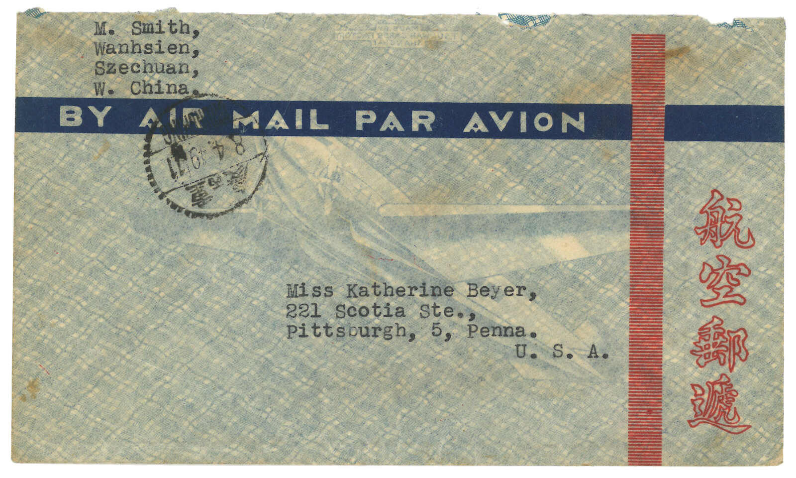 1949.4.3 萬縣寄美國。航空封,背貼孫像改值金圓100元蓋2元x11 + 孫像金圓500元直三連 + 數枚掉票,銷萬縣三格漢英日戳。4.8經重慶。(Image 1) (Image 2)