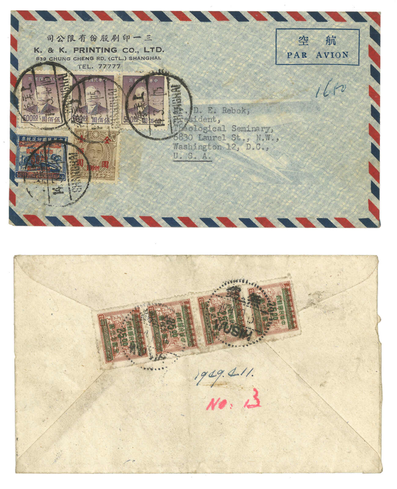 509 cover image1949 a pair of Wusih local and Shanghai-to-USA covers, f.w. Revenue stamp and SYS surch Gold Yuan issues.