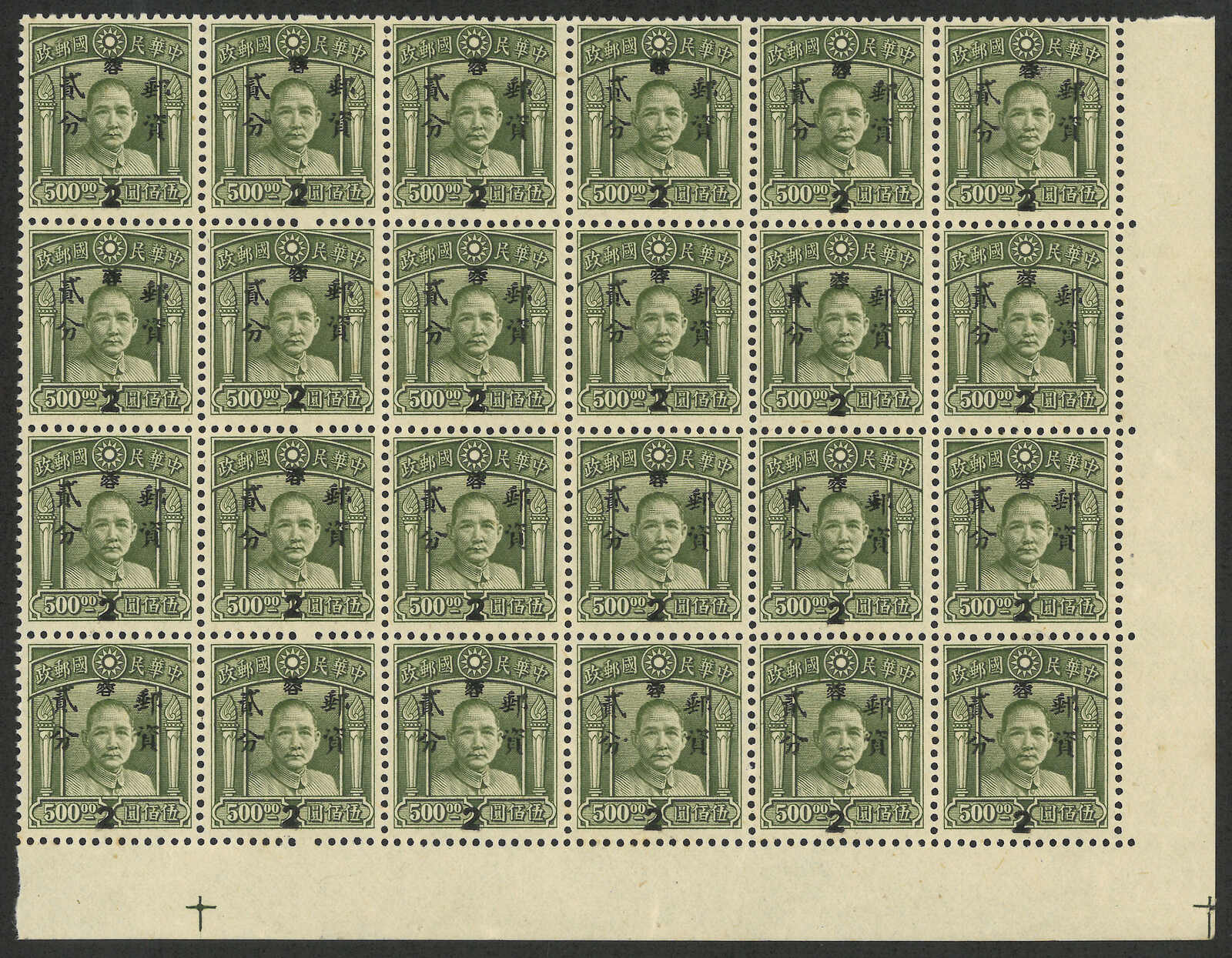 1949年西川機蓋銀圓2分於倫敦四版孫像500元二十四方連新,帶右下直角邊(陳目S139),原膠無貼,品相極佳。(Image 1) (Image 2)