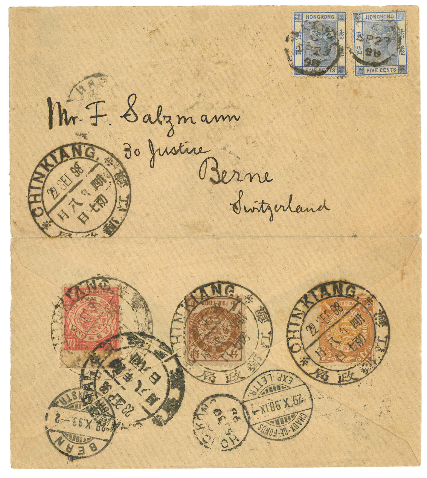 1898.9.22 鎮江寄瑞士F Salzamnn,背貼日本版蟠龍4分 + 5分 + 蟠龍1分,銷鎮江大圓戳。9.23經上海清郵,同樣鈐大圓戳。加貼香港維多利亞女皇像5仙x2,銷上海英局9.23日戳。9.30經香港。10.29抵瑞士。(Image 1)