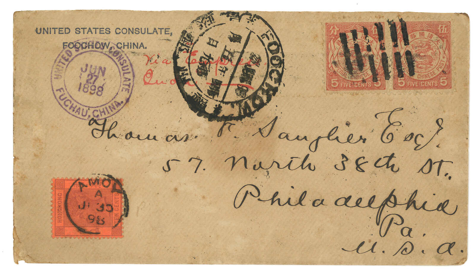 美國駐福州大使館封寄美國,鈐美國駐福州大使館日戳。貼日本版蟠龍5分雙連,銷八卦戳,另見福州大圓戳。6.30經廣州清郵,同樣鈐大圓戳。加貼香港維多利亞女皇像10仙,銷廈門英局6.30日戳。7.25抵美國。經廣州及廈門,而非常見之上海或香港中轉,十分少見奇特。(Image 1)