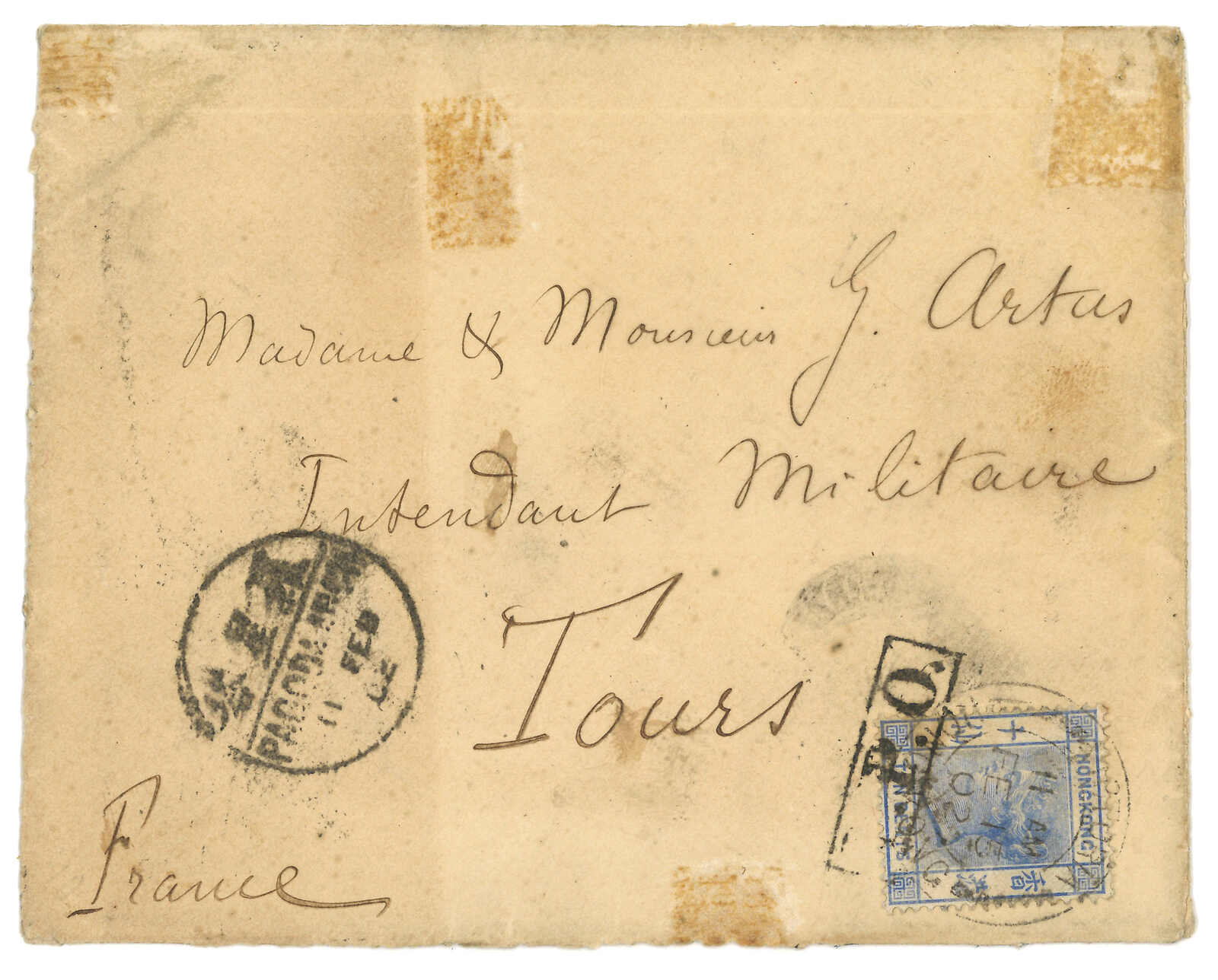 福州寄法國,背貼蟠龍8枚,合1角,銷福州大圓戳,旁鈐珍罕之福州船政紫色同日日戳。2.11經羅星塔。加貼香港維多 利亞女皇像10仙,銷福州IPO騎縫戳及維多利亞2.15中轉戳。3.16抵法國。封剖開作展示。正面有粘痕。出色之福州船政混貼封。(Image 1)