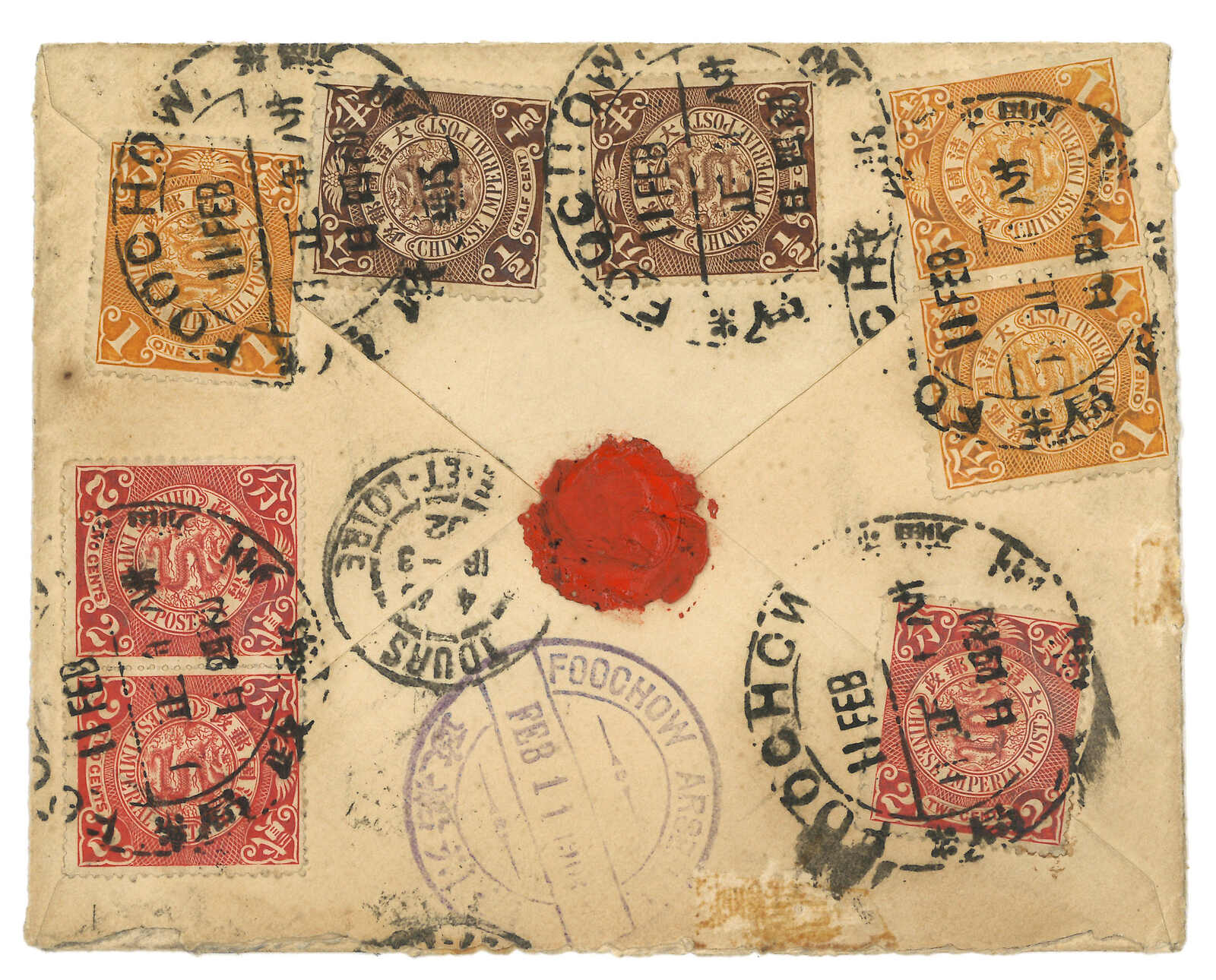 1902 Foochow (11 Feb) to France, f.w. Coiling Dragon x8 on reverse, in total of 10c, tied by Foochow dollar cds., alongside with scarce Foochow Arsenal cds in violet (11 Feb). Transit Pagoda Arch (11 Feb). In combination with