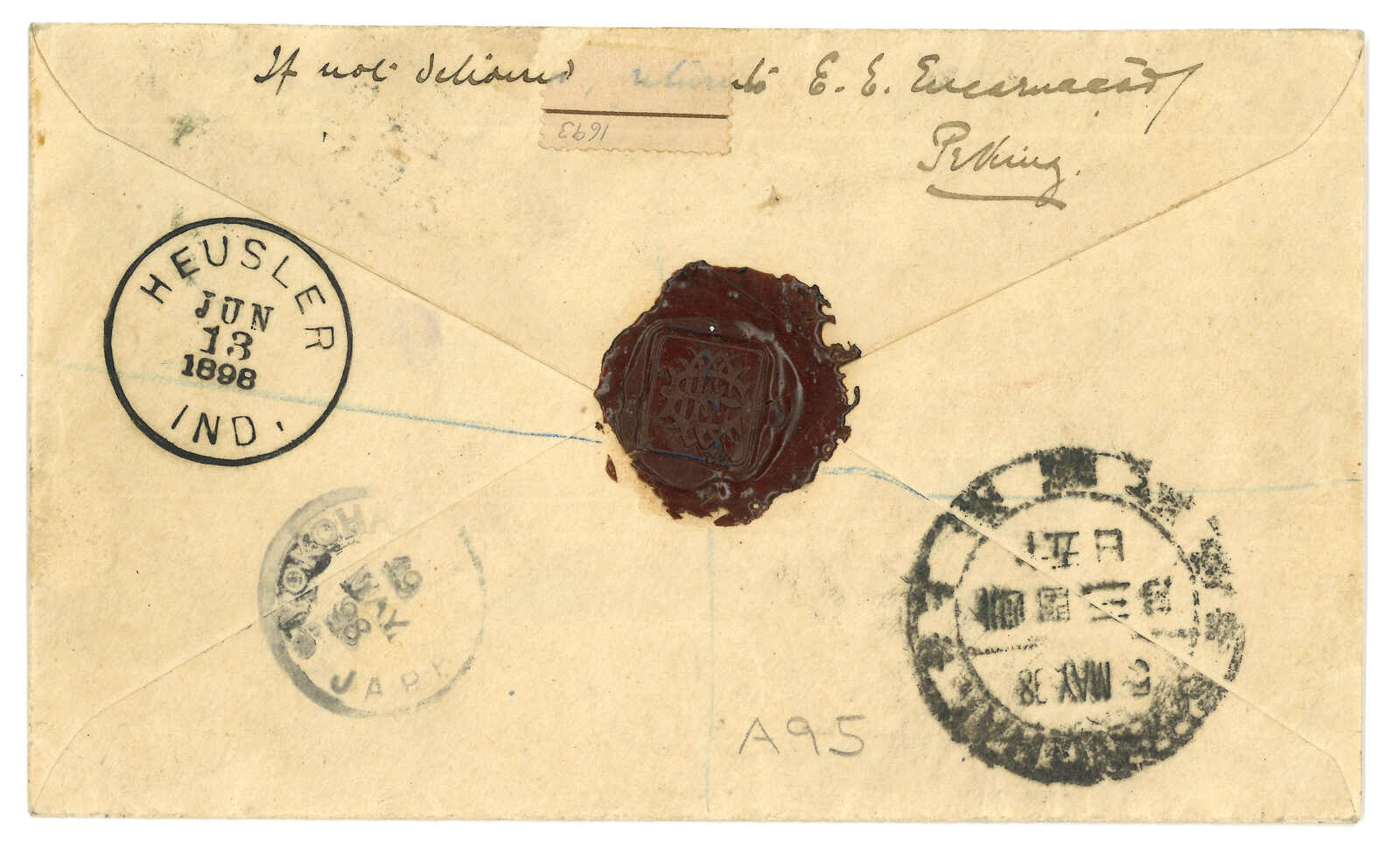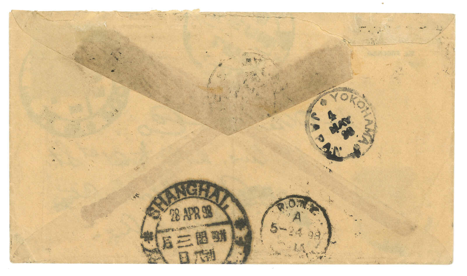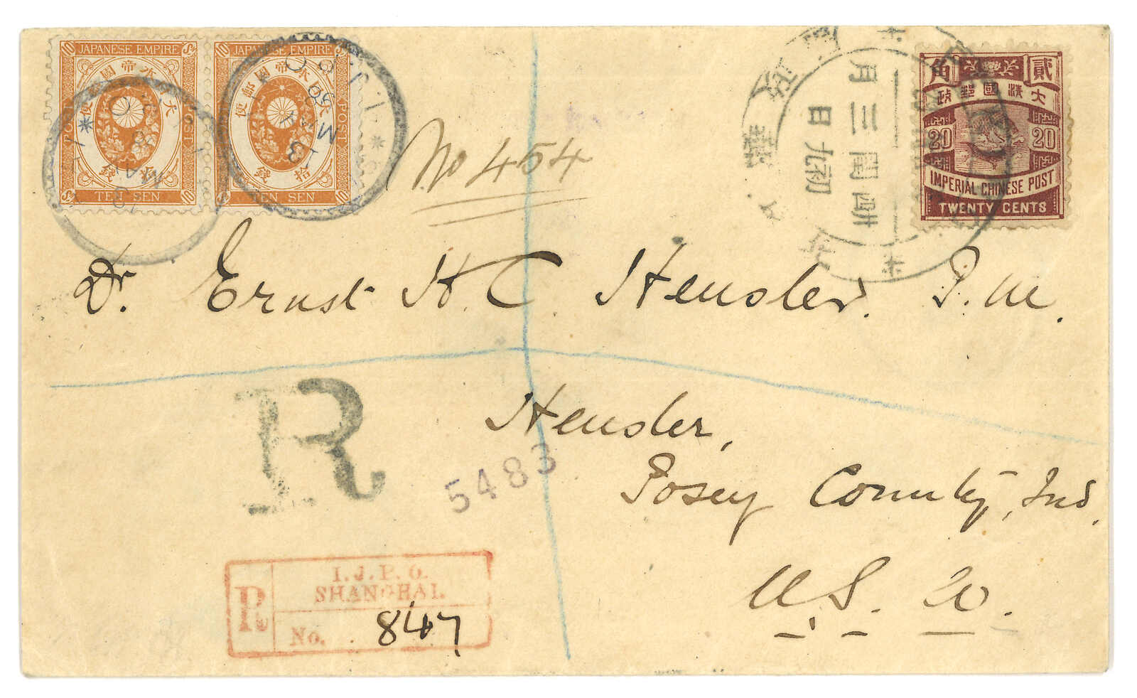 IJPO Shanghai (13 May) cds, matching with registered mark. Transit Yokohama (19 May). Arrived Heusler (13 Jun).