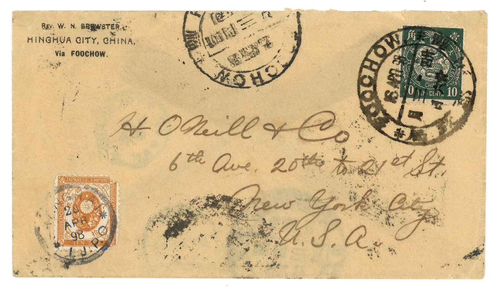 1898 Foochow (26 Apr) to USA, f.w. Litho Dragon 10c, tied by Foochow Dollar cds (with wrong date "16 Apr" instead of "26 Apr"), along with another strike with correct date,. Transit Shanghai (28 Apr) also with dollar cds. In