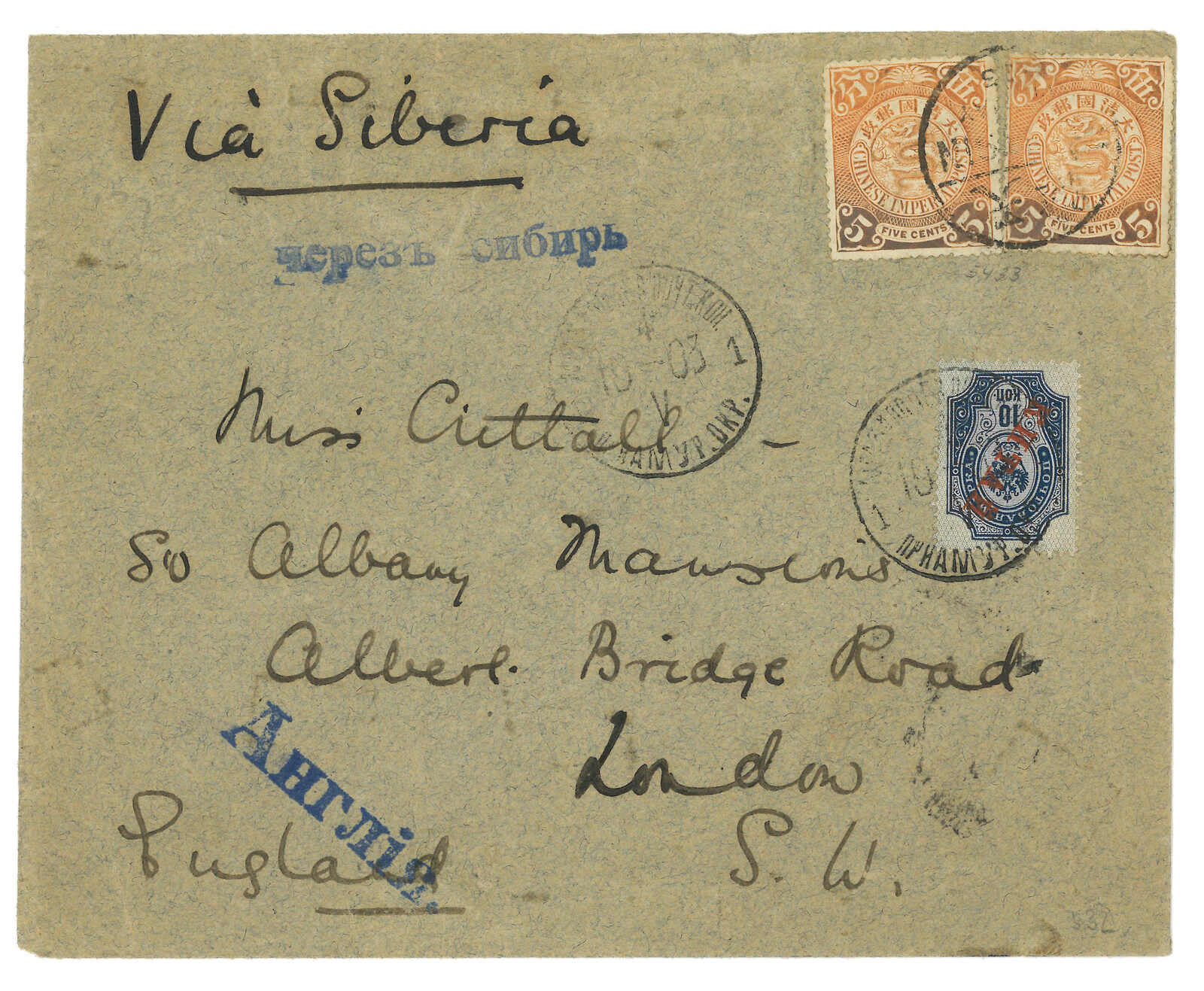 185 image1903 Tientsin (May) to England via Siberia, f.w. Coiling Dragon 5c x2, tied by Tientsin bisected bilingual cds. Transit Newchwang Chinese PO (6 May). In combination with Russian Coat of Arms ovpt. KITAI 10k, tied by Inkow (Newchwang) Russian FPO No. 13 T&S type 1 cds (4 May). Showing "Via Siberia" and "England" cachet in Russian. Arrived London (6 Jun). Cover back with mounting remnants.