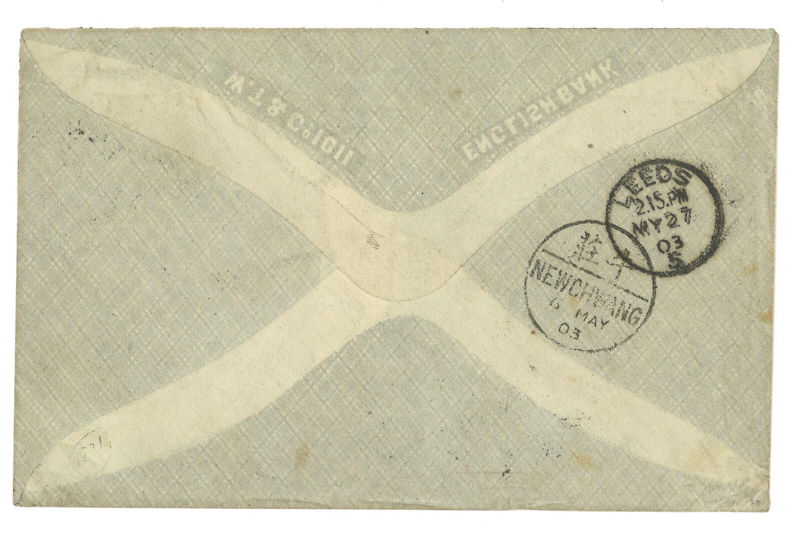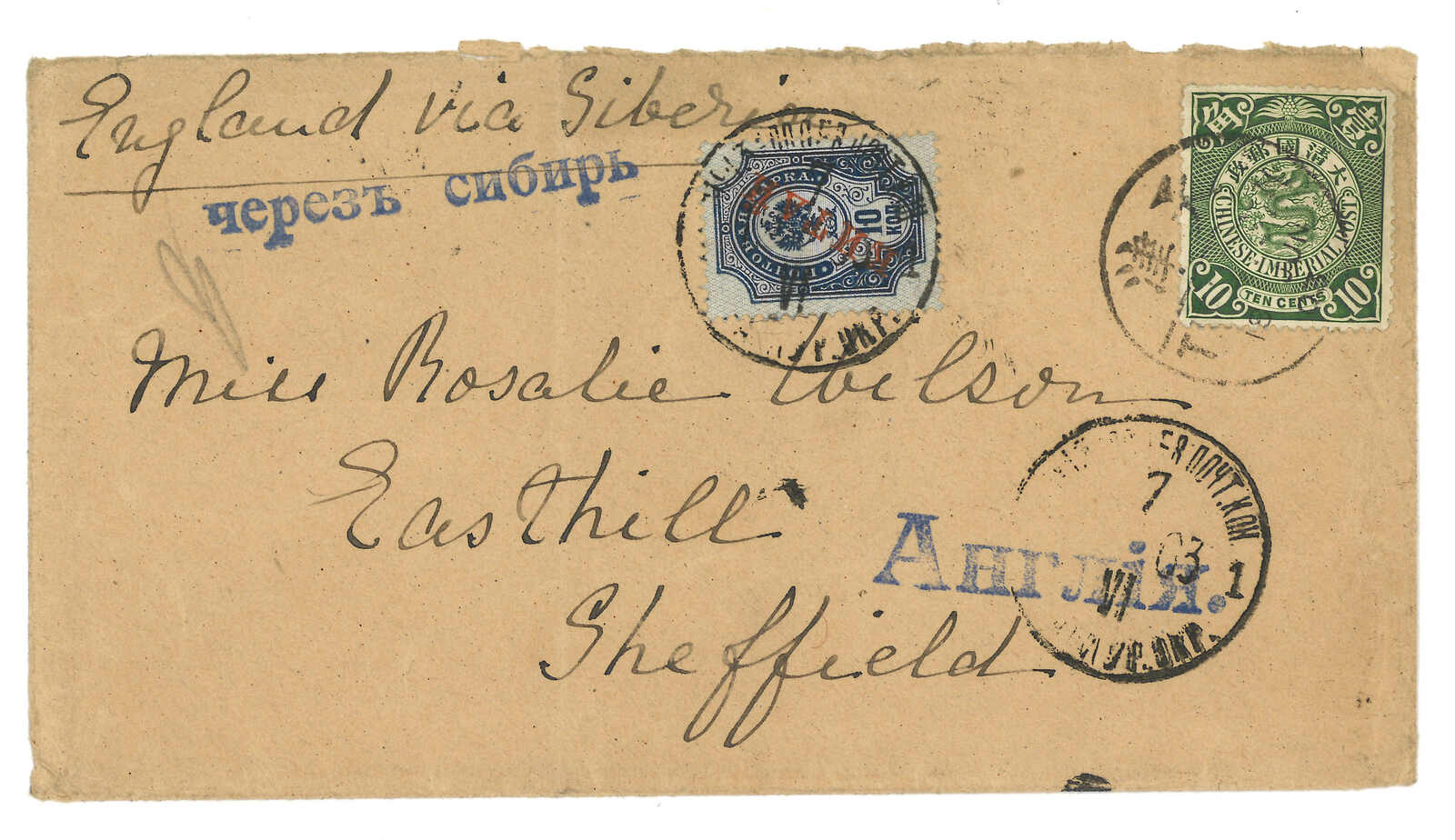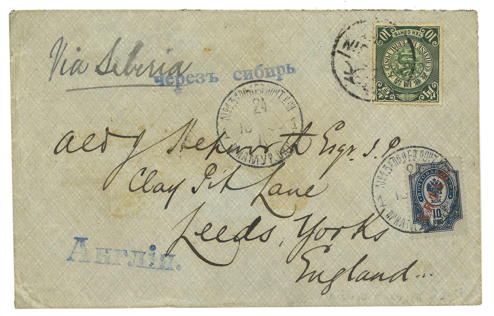 186 image1903 Tientsin (May) to England via Siberia, f.w. Coiling Dragon 10c, tied by Tientsin bisected bilingual cds. Transit Newchwang (6 May). In combination with Russian Coat of Arms ovpt. KITAI 10k, tied by Inkow (Newchwang) Russian FPO No. 13 T&S type 1 cds (24 Apr). Showing "Via Siberia" and "England" cachet in Russian. Arrived Leeds (27 May).