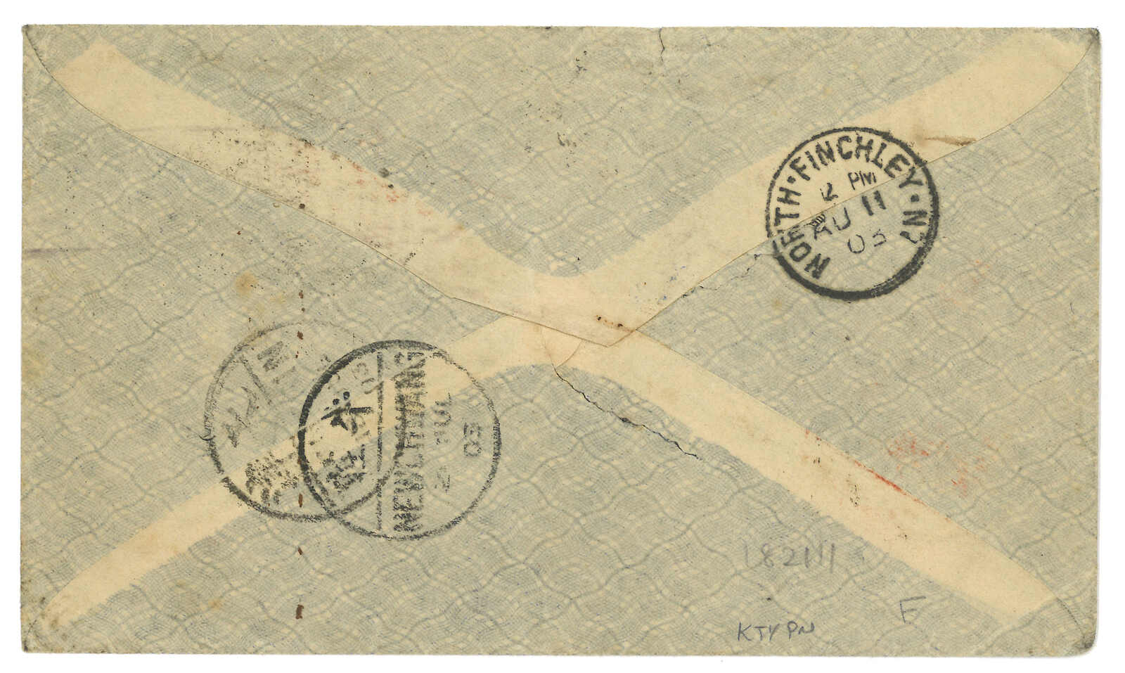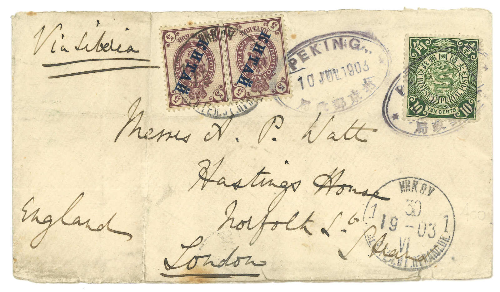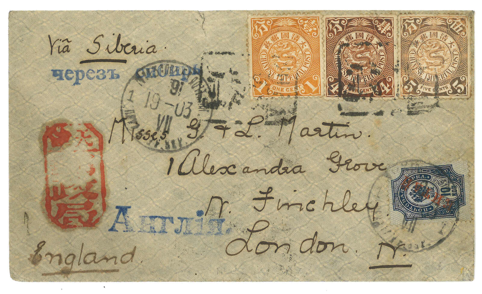 187 image1903 Tientsin (18 Jul) to England via Siberia, f.w. Coiling Dragon 1c + 4c +5c, tied by Tientsin PO tombstone cancel cds. Transit Newchwang (2X Jul). In combination with Russian Coat of Arms ovpt. KITAI 10k, tied by Inkow (Newchwang) Russian FPO No. 13 T&S type 1 cds (9 Jul). Showing "Via Siberia" and "England" cachet in Russian. Arrived North Finchley (11 Aug).