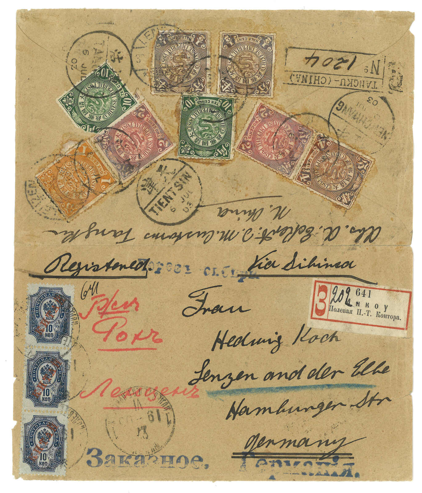1903.7.6 塘沽經西伯利亞寄德國,背貼蟠龍8枚合3角,銷塘沽半切漢英日戳。7.6經天津,同月經牛莊。加貼軍徽圖加蓋KITAI 10戈比直三連,銷營口(牛莊)俄局(6.27)T&S 2型日戳,另貼俄文掛號標籤。抵德國。封剖開以作展示。T&S指營口俄局2型日戳蓋於10戈比票上十分少見難得。(Image 1)