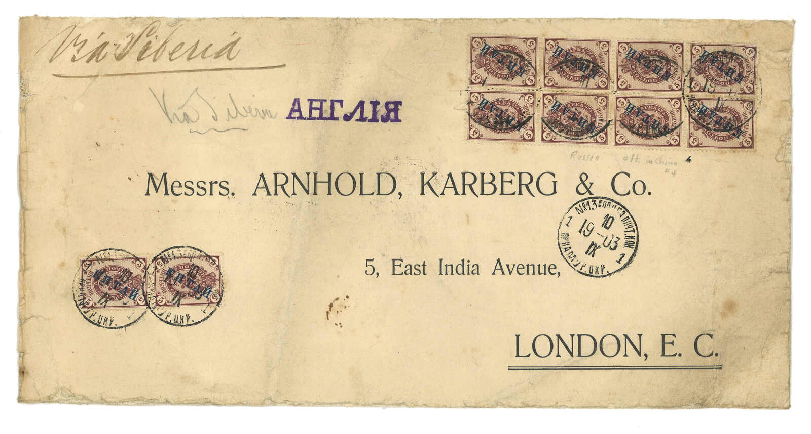 188 image1903 Tientsin (21 Sep) to England via Siberia, f.w. CIP 50c on reverse, tied by Tientsin bisected bilingual cds. Transit Newchwang (23 Sep). In combination with Coat of Arms ovpt. KITAI 5k x10 on front, tied by Inkow (Newchwang) Russian FPO No. 13 T&S type 1 cds (10 Sep). Transit Chinese Eastern Railway line 262 (12 Sep) with scarce T&S type 1 (serial 5) cds. Arrived London (14 Oct). Nice high denomination franking of CIP 50c. T&S also stated that postal materials of line 262 during early 1900s are rare as only several loose stamps recorded. With folds and rough edges.