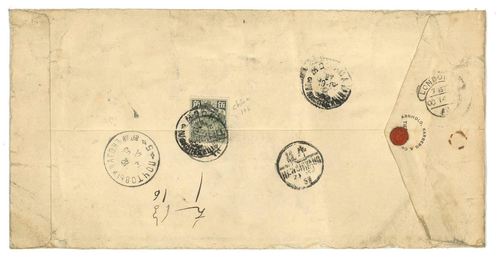 189 image1903 Peking (10 Jul) to England via Siberia, f.w. Coiling Dragon 10c, tied by Peking PO oval d.s. Transit Newchwang (12 Jul). In combination with Coat of Arms ovpt. KITAI 5k in pair, tied by Inkow (Newchwang) Russian PO T&S type 2 cds (30 Jun). Arrived London (3 Aug). Flap missing.