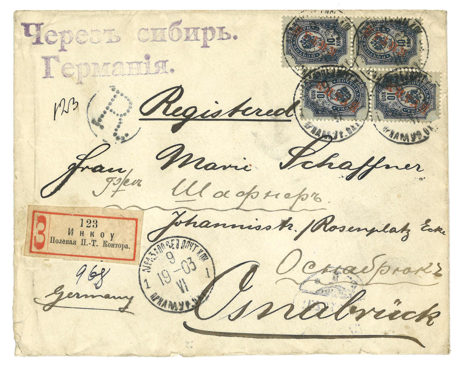 194 image1903 Tientsin (19 Jun) to Germany via Siberia, f.w. Coiling Dragon 10c in block of 4 on reverse, tied by Tientsin bisected bilingual cds, alongside with registered mark. Transit Newchwang (22 Jun). In combination with Coat of Arms ovpt. KITAI 10k x4, tied by Inkow (Newchwang) Russian FPO No. 13 T&S type 1 cds (9 Jun), alongside with Russian registered label. Arrived Germany (11 Jul).