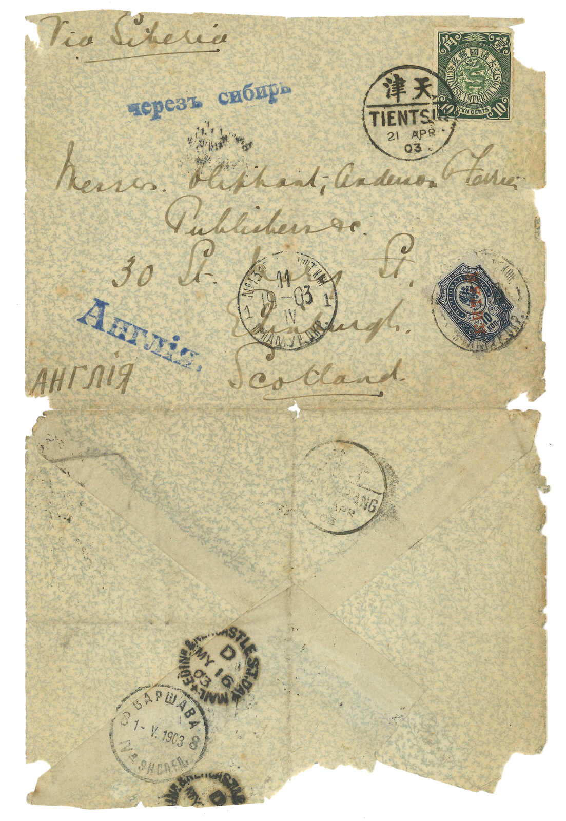 1903.4.21 天津經西伯利亞寄蘇格蘭,貼蟠龍1角,銷天津半切漢英日戳。4.24經牛莊。加貼軍徽圖加蓋KITAI 10戈比,銷營口(牛莊)俄軍13局T&S 1型日戳(4.11)。5.1經華沙。5.16抵蘇格蘭。封四邊被裁,邊沿磨損。(Image 1)