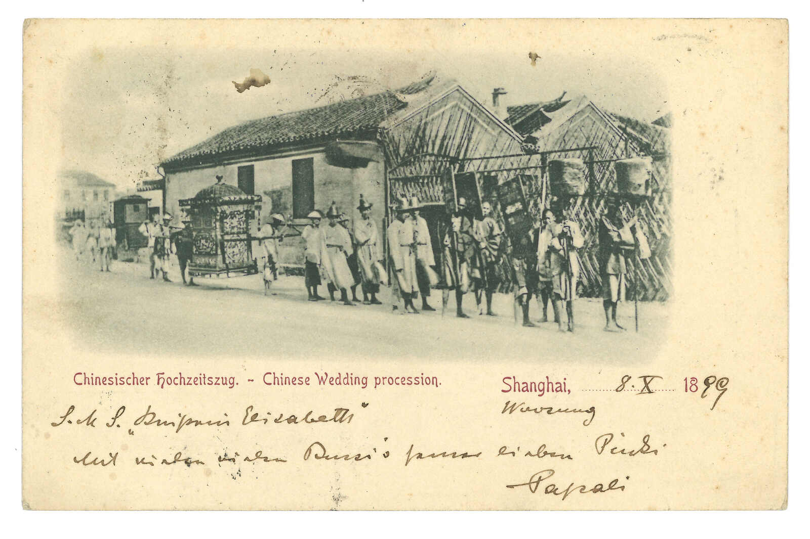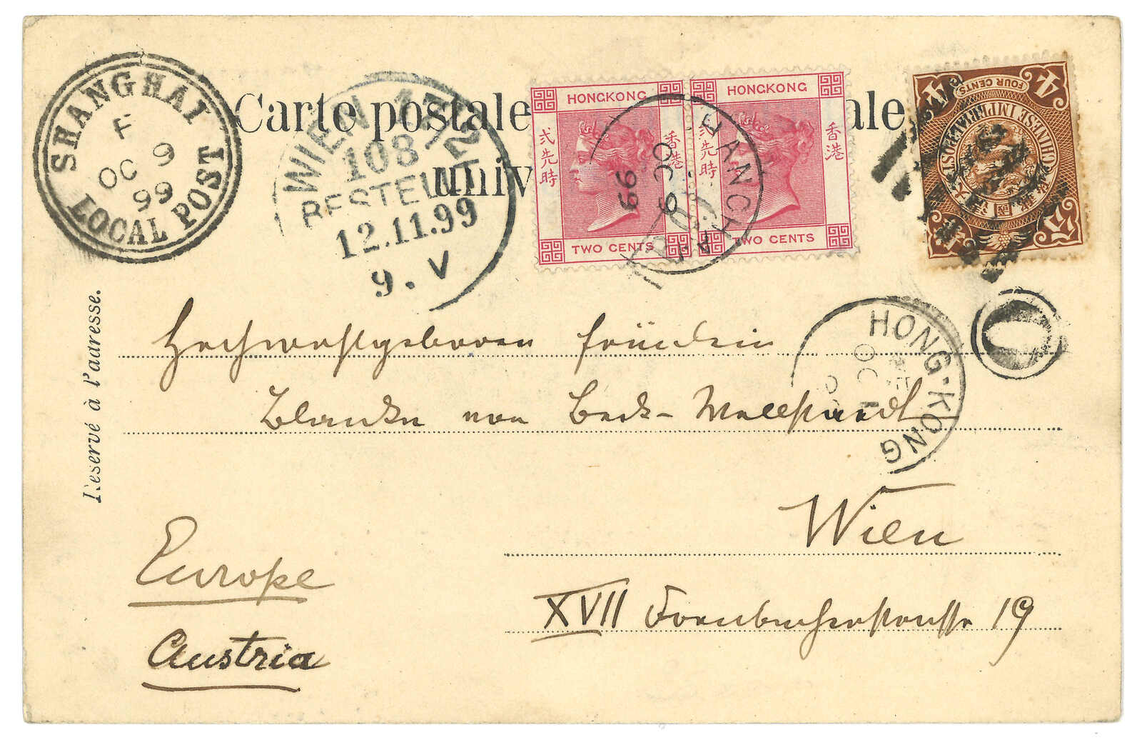 1899.10.9 上海寄奧國。圖片明信片,鈐上海工部郵局始發日戳。貼蟠龍4分,銷八卦戳。加貼香港維多利亞女皇像2仙雙連,銷上海IPO騎縫戳及上海英局10.9中轉戳。10.1經香港。11.12抵維也納。(Image 1) (Image 2)