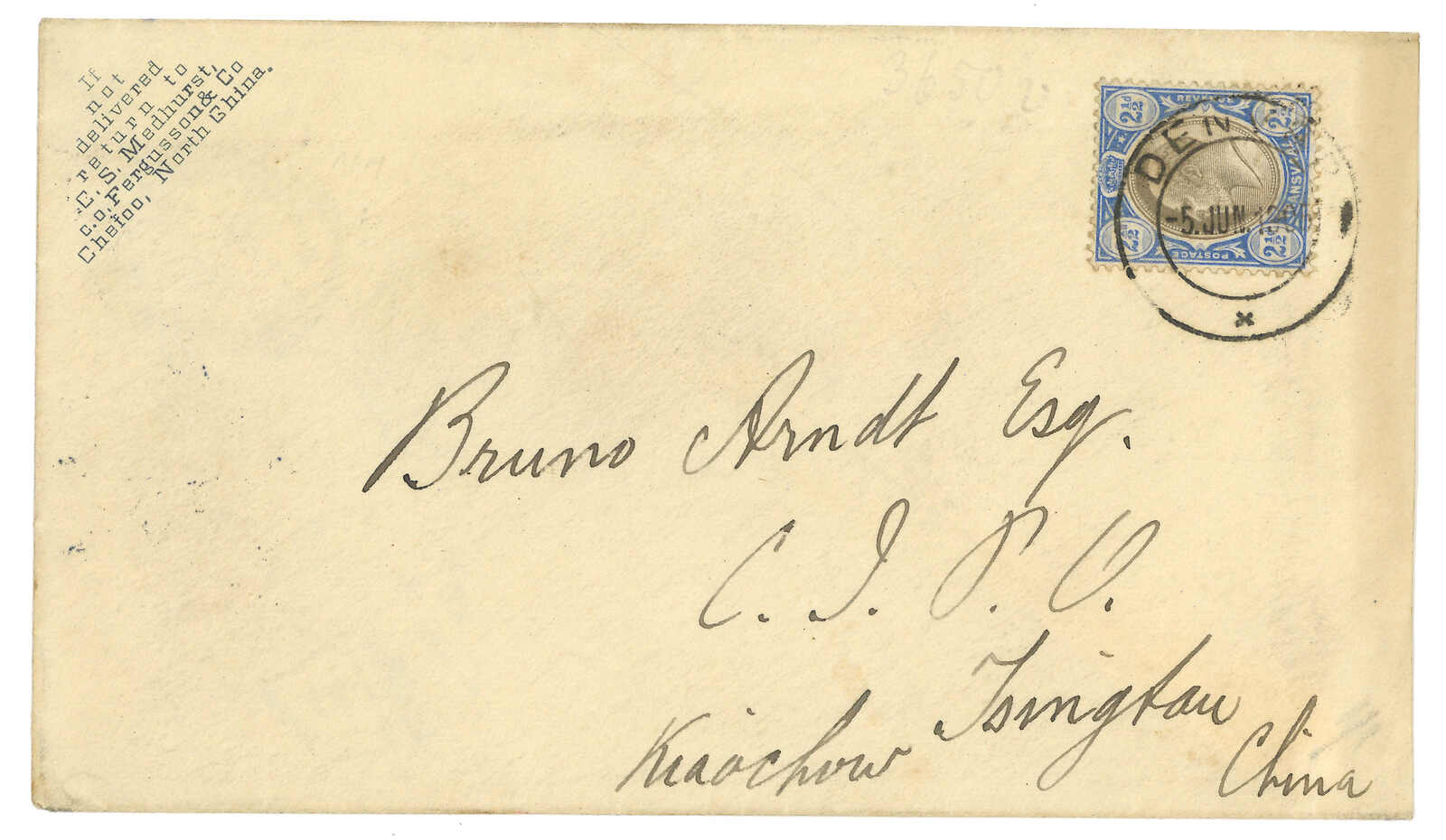 1905 South Africa (5 Jun) to Tsingtau, f.w. Transvaal KEVII 2-1/2d, tied by Denver cds. Transit Hong Kong (14 Jul), Shanghai Chinese PO (19 Jul). Arrived Tsingtau German PO (24 Jul). Nice incoming example from South Africa.