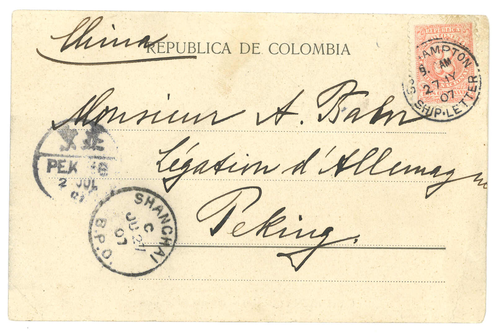 1907 Colombia (27 May) to Peking. Picture postcard, f.w. Colombia 2c. Transit Shanghai BPO (27 Jun). Arrived Peking Chinese PO (2 Jul). Nice incoming example of South America.