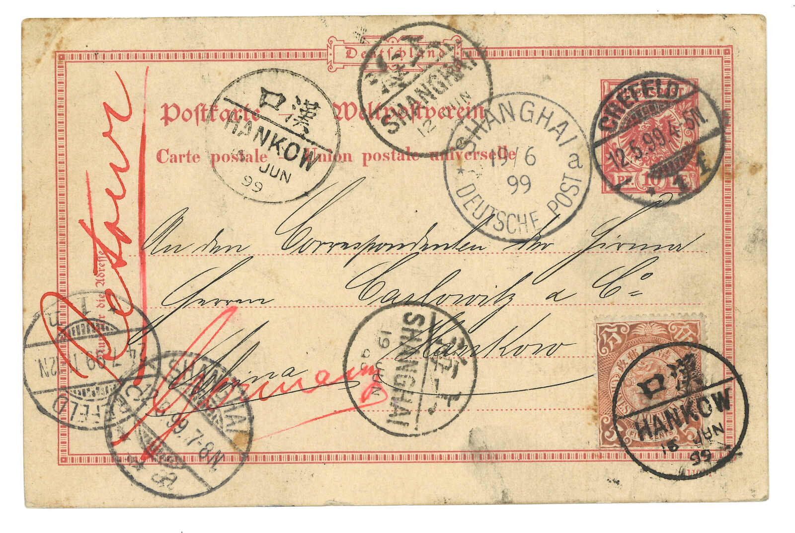 1899 (12 May) German 10pf PSC to Hankow, returned to sender, tied by Chefeld cds. Transit Shanghai German andn Chinese PO (12 Jun). Showing "Gone Away / Retour" annotation upon arrival. F.w. Coiling Dragon 5c for return, tied