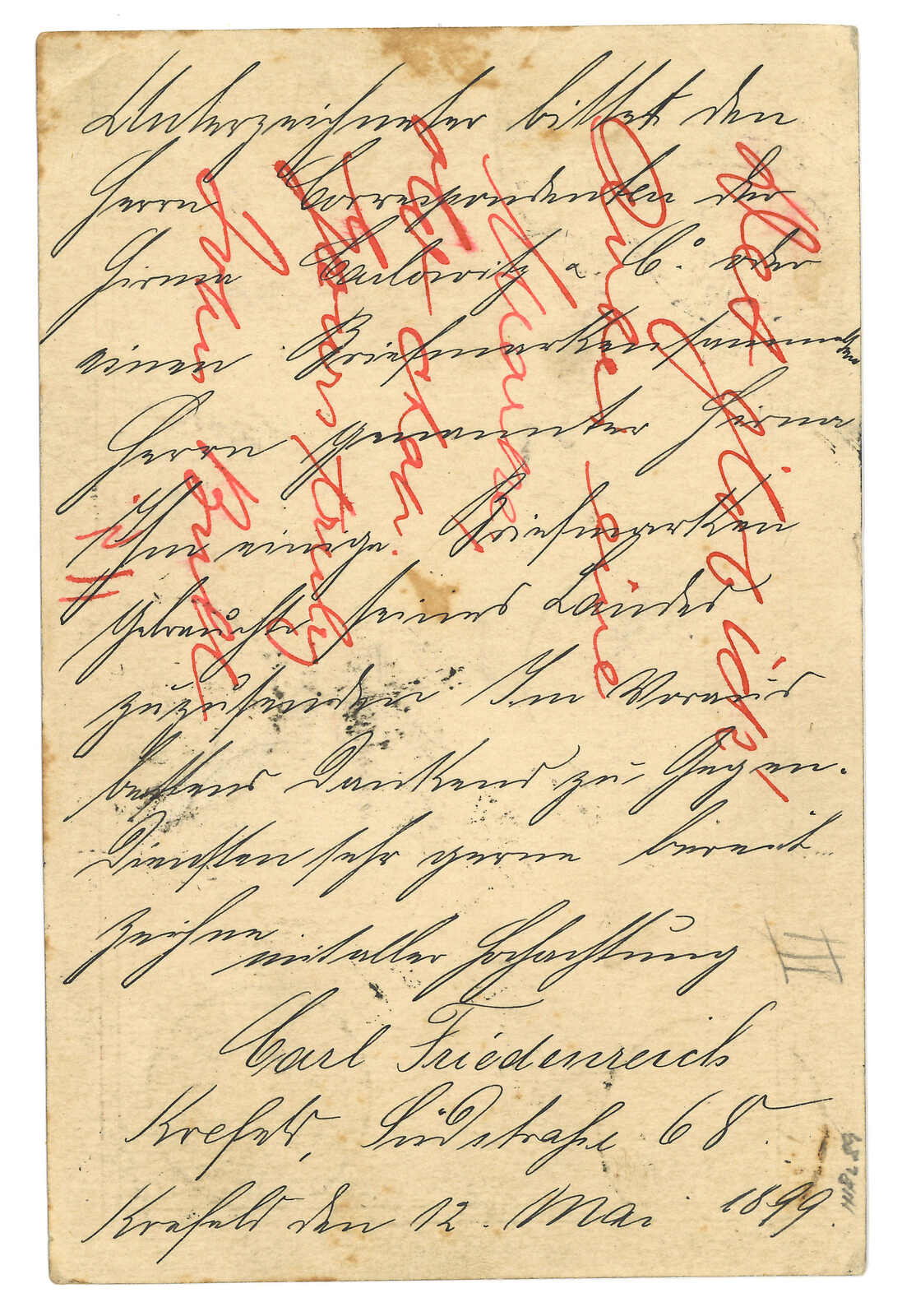 1899.5.12 德國10芬尼郵資片寄漢口,退回寄件人。郵資圖銷Chefeld日戳。6.12經上海德局及清郵。到達漢口寫有“Gone Away / Retour”批示。貼蟠龍5分退回德國,銷漢口6.16日戳。6.19經上海郵郵及德局。(Image 1)