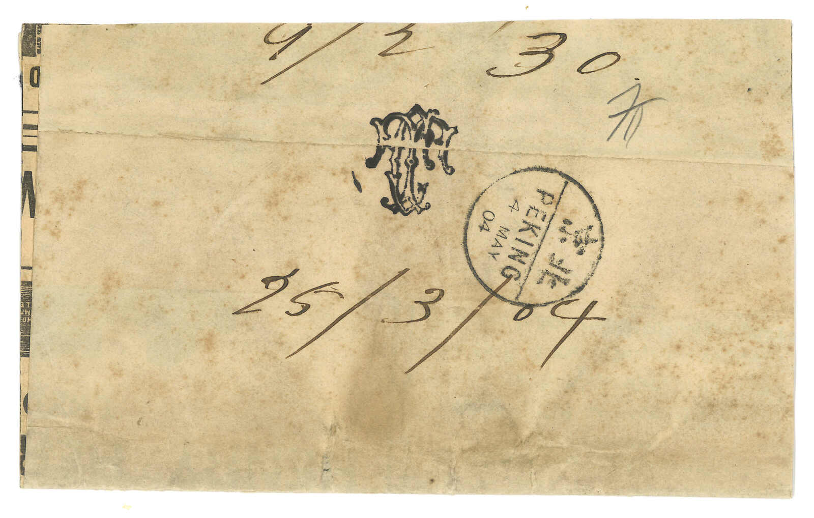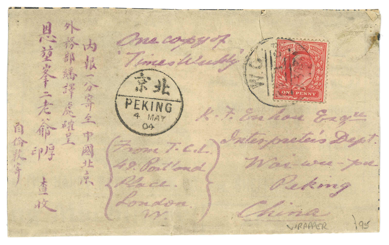 1904 England to Interpreter's Department, Foreign Office, Peking. Wrapper, f.w. KEVII 1d, tied by WC cds. Arrived Peking (4 May). Cover opened out for display.