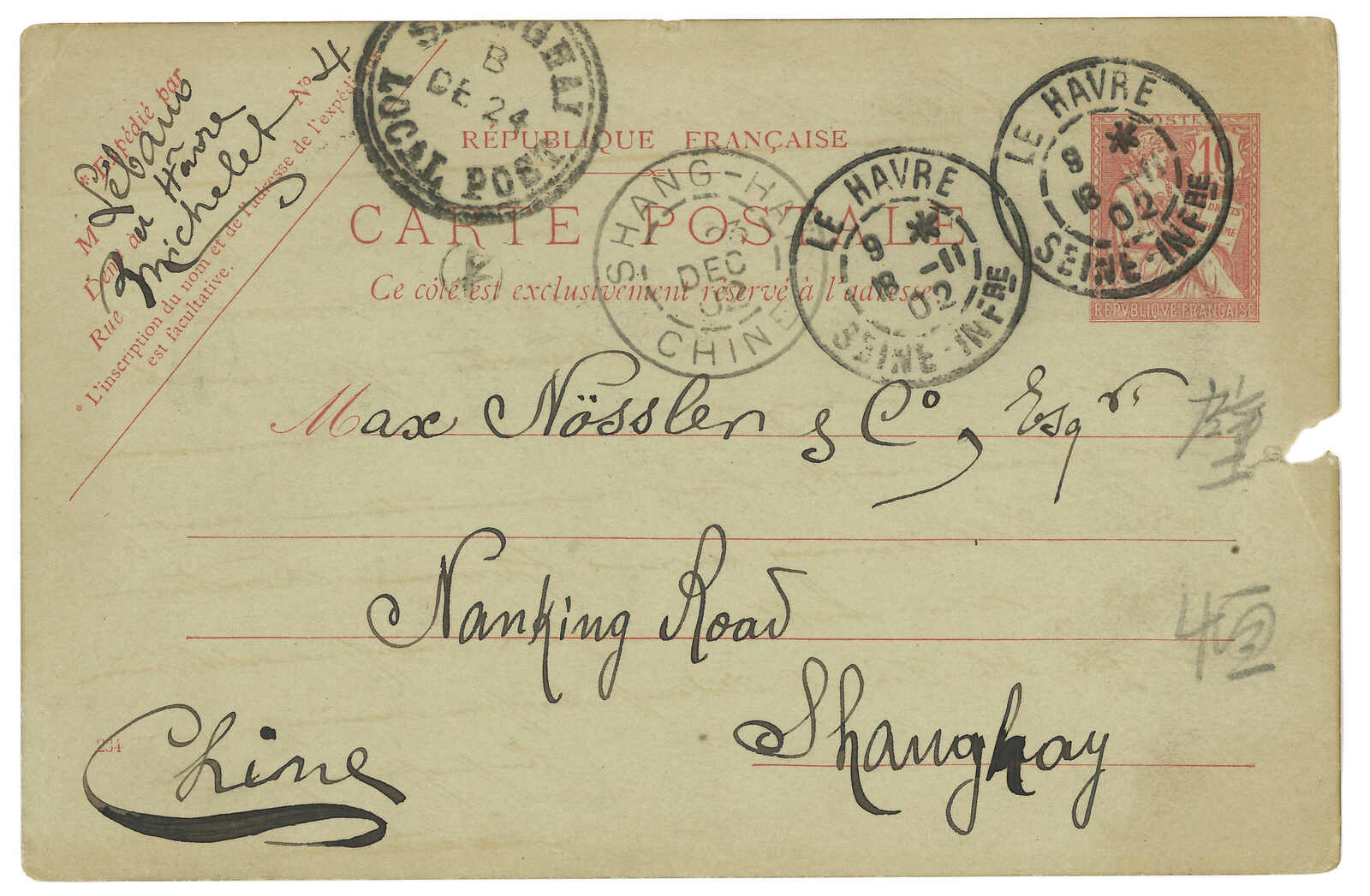 1902 France (18 Nov) to Shanghai. French 10c PSC, tied by Le Havre cds. Transit Shanghai French PO (23 Dec). Arrived Shanghai LPO (24 Dec). Small damage at right edge but not affecting postmark.