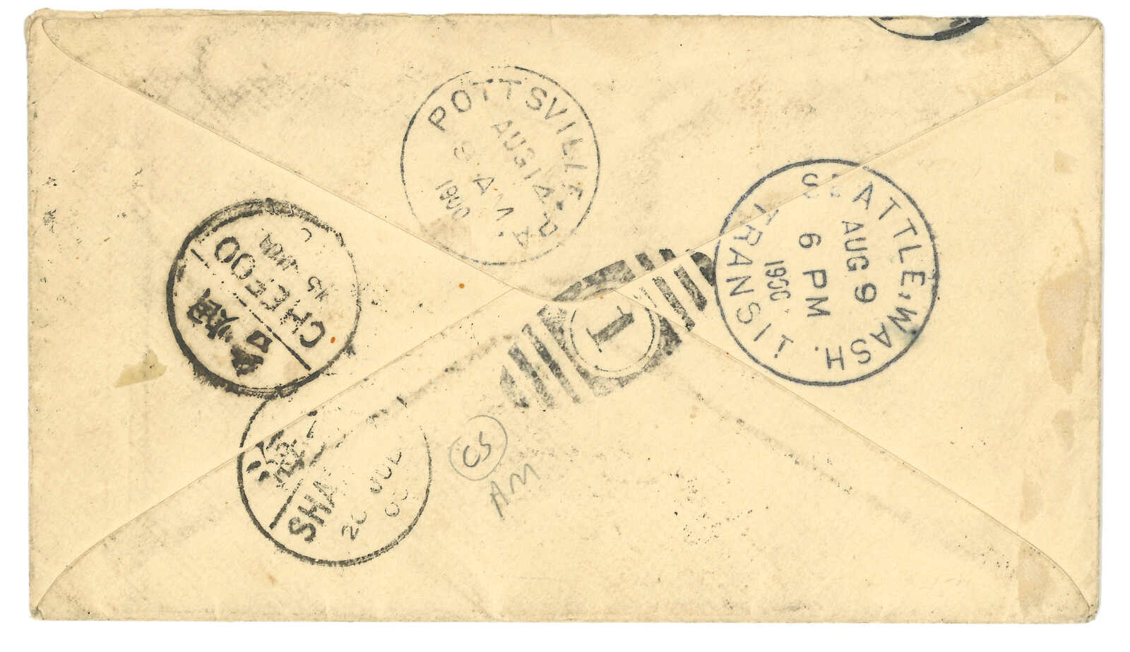 CENTS”橫戳(手寫“5”)。8.9經西雅圖。8.14抵Pottsville。寄萬國郵盟成員國之半盎司信函郵資應為1角。(Image 1)