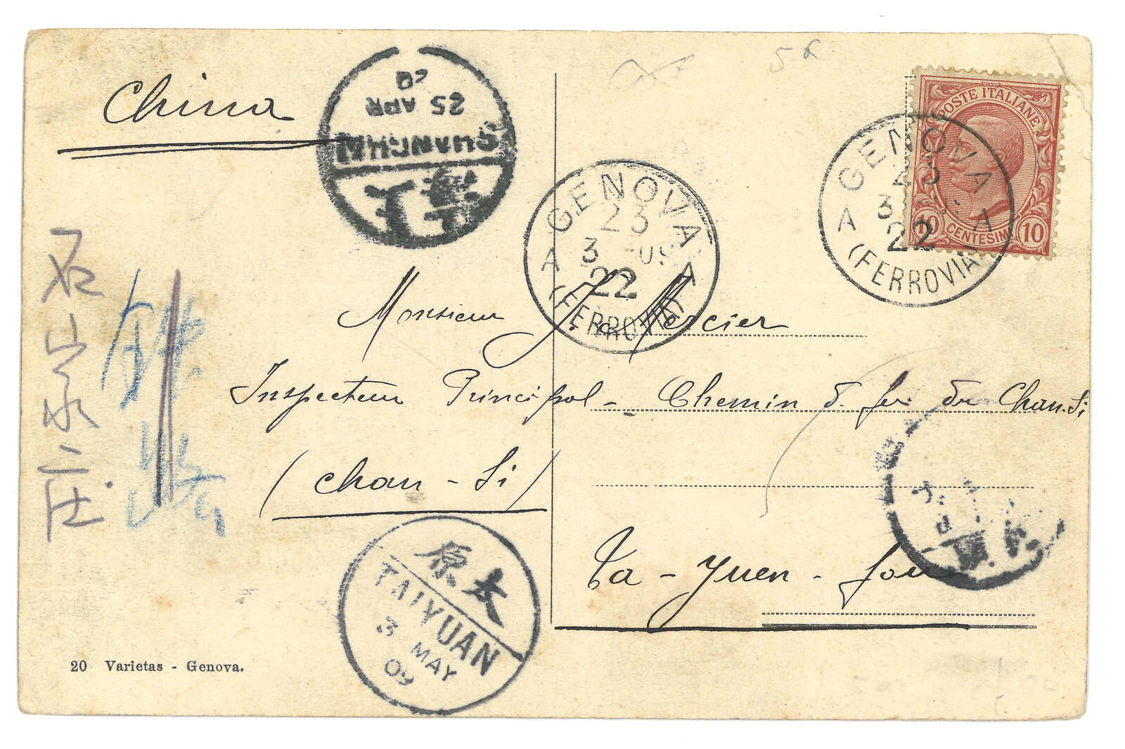 1909 Italy (23 Mar) to Tayuen. View PPC, f.w. Italian 10c, tied by Genova cds. Transit Shanghai Chinese PO (25 Apr). Arrived Taiyuan (3 May).