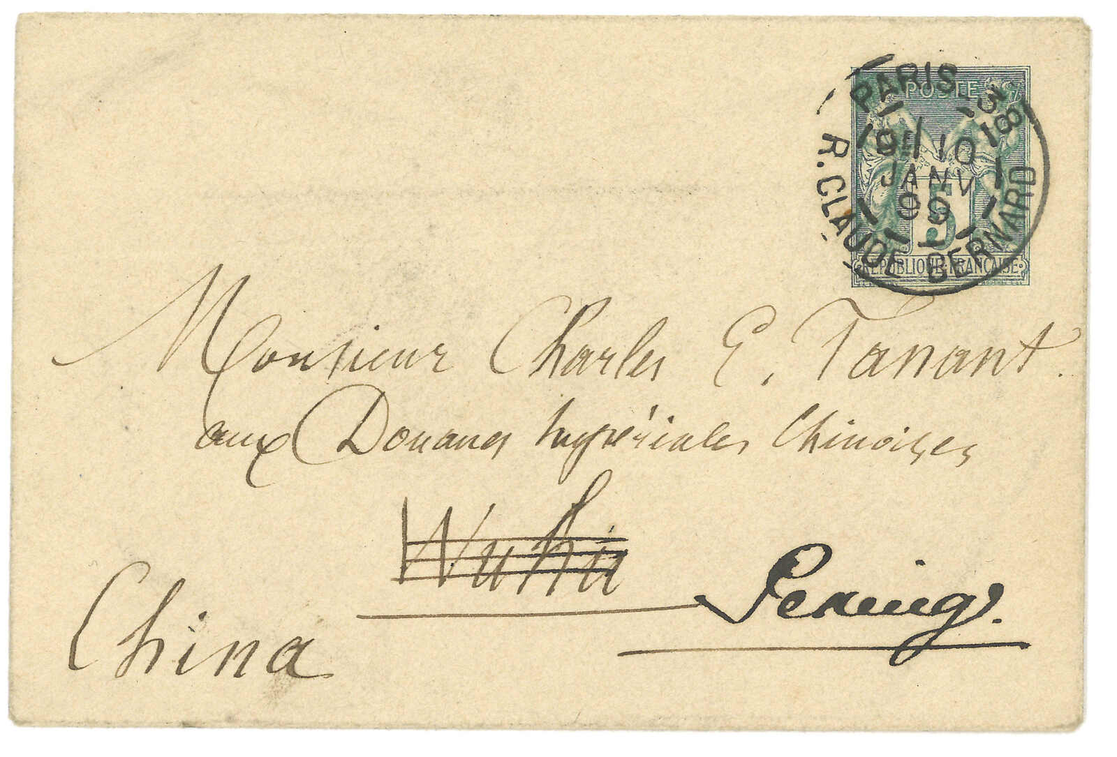 1899 (10 Jan) French 5c stationery cover to C.E. Tanant, Wuhu, redirected to Peking, tied by Paris cds. Transit Shanghai Chinese PO (18 Feb). Arrived Wuhu (20 Feb) with dollar cds. Redirecetd to Peking (1 Mar) with "Customs"