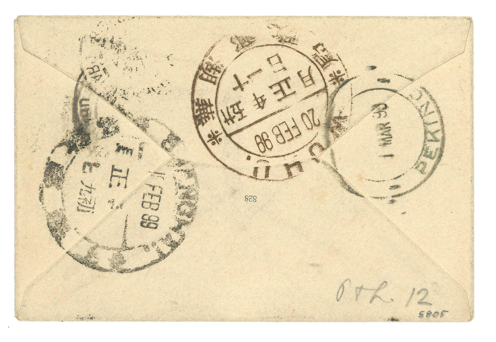 1899.1.10 法國5生丁郵資封寄蕪湖的譚安,改寄北京,銷巴黎日戳。2.18經上海清局。2.20抵蕪湖,鈐大圓戳。再改寄北京(3.1),鈐挖海關黑色日戳。鈐蕪湖大圓戳之出色譚安封。北京挖海關日戳亦遠比天津挖海關日戳少見。張愷升記錄僅見於1898年2月至1899年2月,此例更晚。2004.1 PhilaChina,拍品號975。(Image 1)
