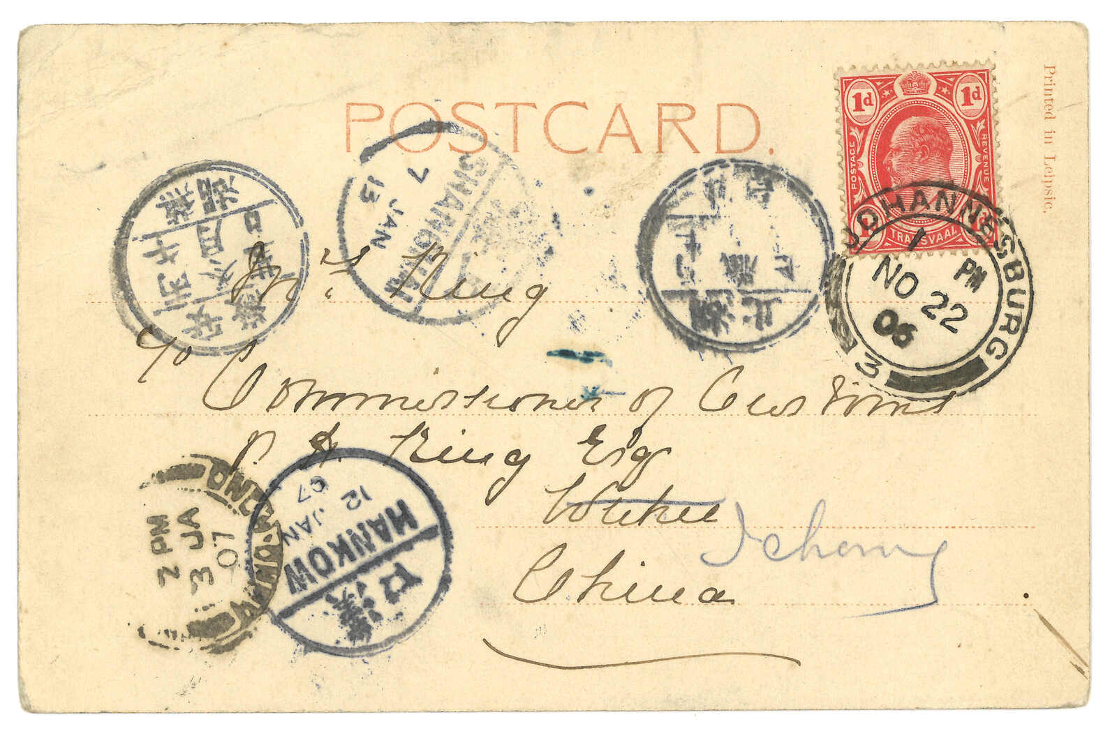 1906 South Africa (22 Nov) to Wuhu, redirected to Ichang. Picture postcard, f.w. KEVII 1d, tied by Johannesburg cds. Transit Hong Kong (3 Jan), Shanghai Chinese PO (7 Jan)), Hankow (12 Jan). Arrived Wuhu (7 Feb) with lunar year