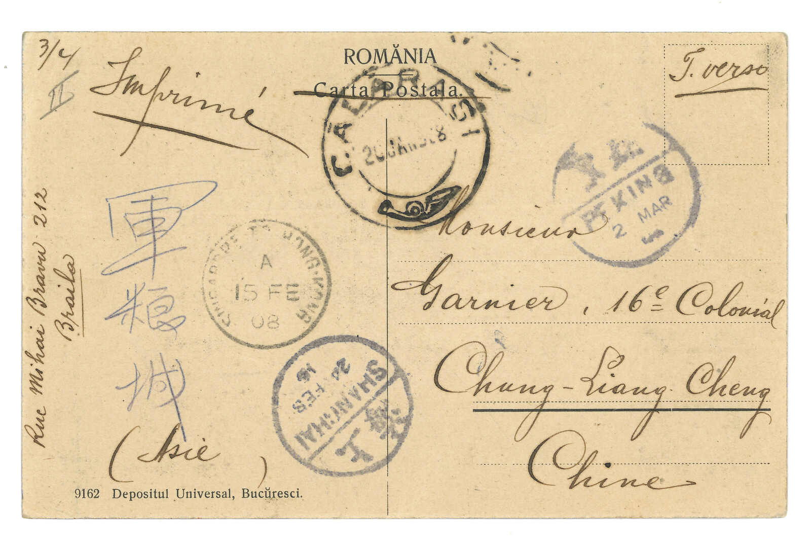 1908 Romania (20 Jan) to Chunliangcheng. Picture postcard, f.w. Romanian 5 bani, tied by Calarasi cds. Transit with Singapore-to-Hong Kong marine sorter (15 Feb), Shanghai Chinese PO (24 Feb). Arrived Peking (2 Mar). Very
