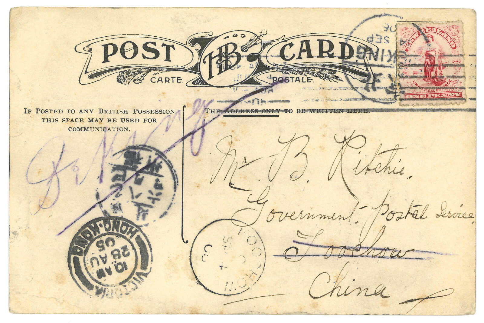 1905 New Zealand (4 Jun) to Foochow, redirected to Peking. Picture postcard, f.w. New Zealand 1d, tied by meter stamp. Transit Hong Kong (28 Aug). Arrived Foochow BPO and Chinese PO (4 Sep). Redirected to Peking (14 Sep). Nice