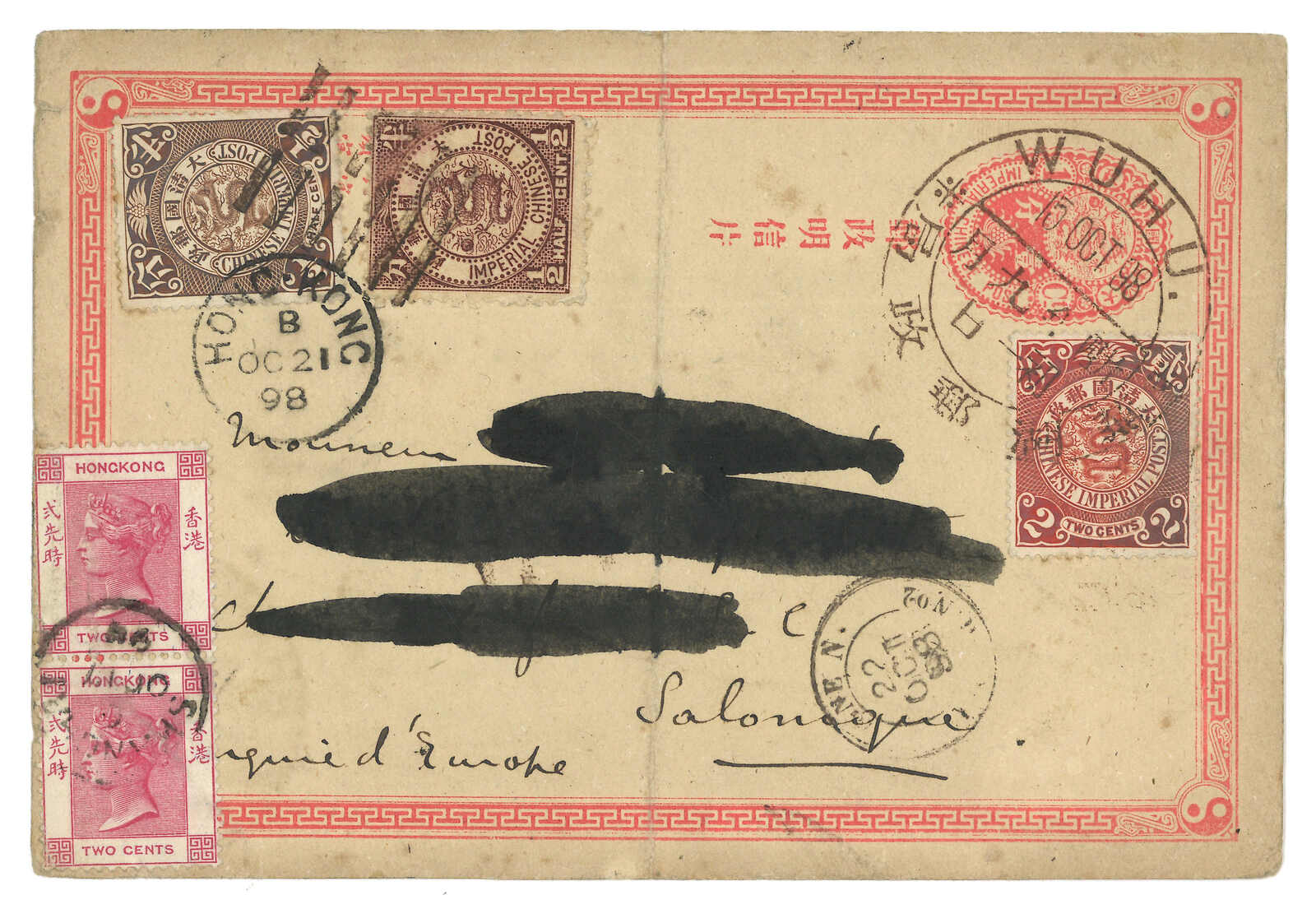1898 Wuhu (15 Oct) to Greece. ICP 1st print PSC, uprated by Litho Dragon 1/2c + Coiling Dragon 1/2c + 2c, tied by Wuhu Dollar cds and Pakua chop. Transit Shanghai Chinese PO (17 Oct). In combination with Hong Kong QV 2c in