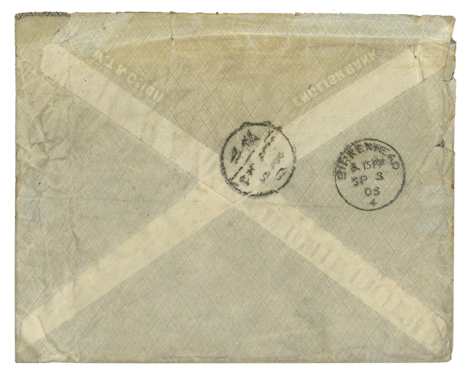 233 cover image1903 Weihaiwei (Aug) to England, f.w. Coiling Dragon 1/2c in strip of 4, tied by faint Weihaiwei bilingual cds in black. Transit Chefoo Chinese PO. In combination with Coat of Arms ovpt. KITAI x5, in total of 20k, tied by Chefoo Russian PO T&S type 1 cds. Arrived Birkenhead (9 Sep). Rough edges. 2012 (Apr) David Feldman, lot 20079.